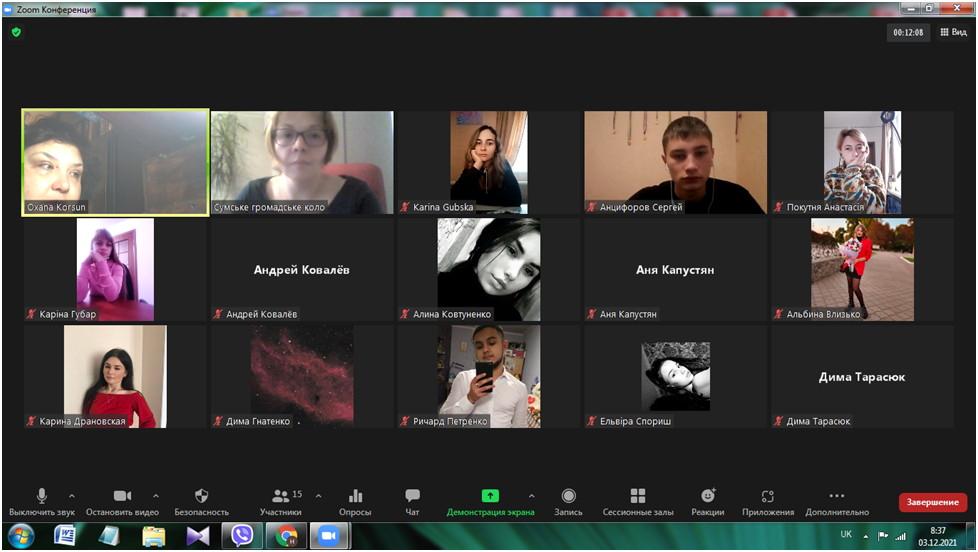 06 грудня 2021 року для студентів 3 курсу спеціальності «Правоохоронна діяльність» професором кафедри юридичних дисциплін Сумської філії ХНУВС Наталією Горобець було проведено бінарне семінарське заняття за участю практичного психолога Оксани Корсун. Темою зустрічі було обрано «Сімейні конфлікти. Роль адвоката та правоохоронців у їх подоланні».
