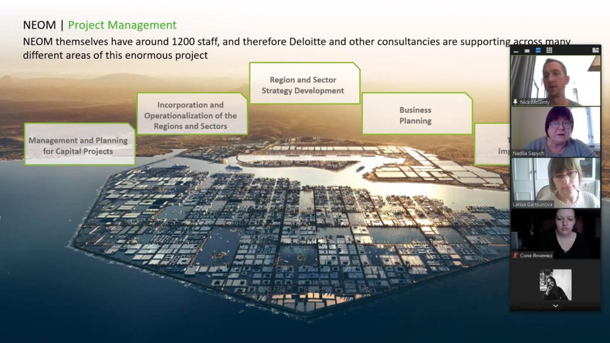Для обміну досвідом був запрошений Nick McGinty - Director of mergers and acquisitions in Deloitte consulting. Тема «Управлінський контроль» розглядалася на прикладі грандіозного проєкту Саудівської Аравії «THE LINE – NEOM» («Неом – місто майбутнього»).