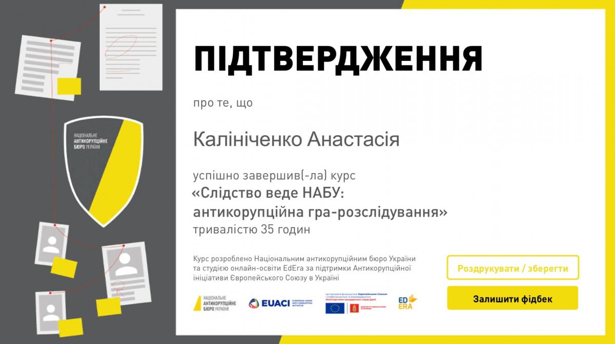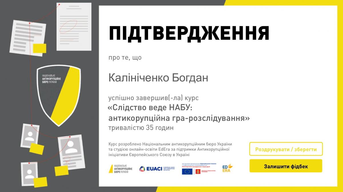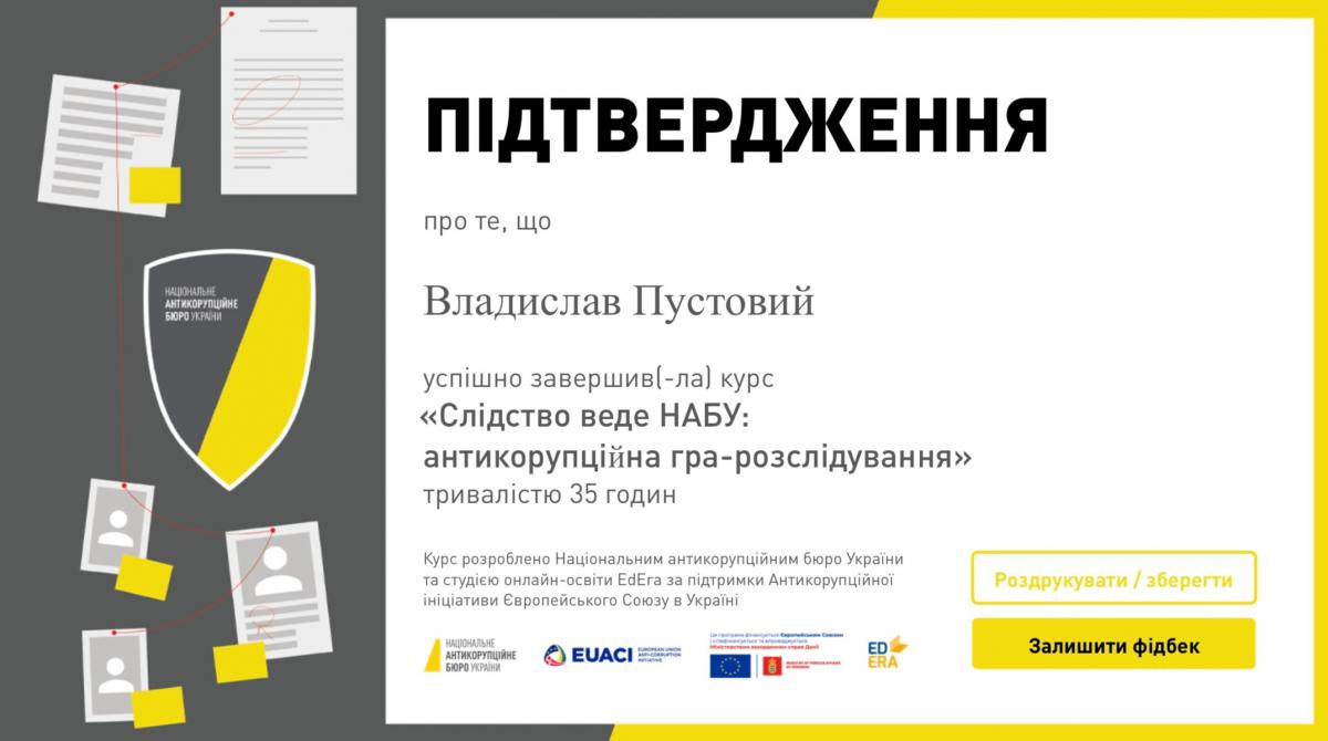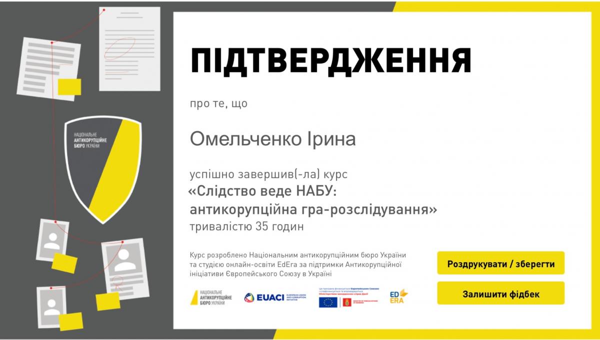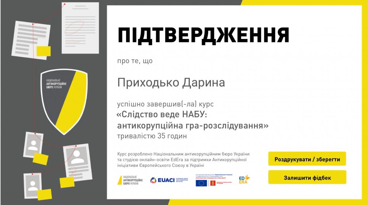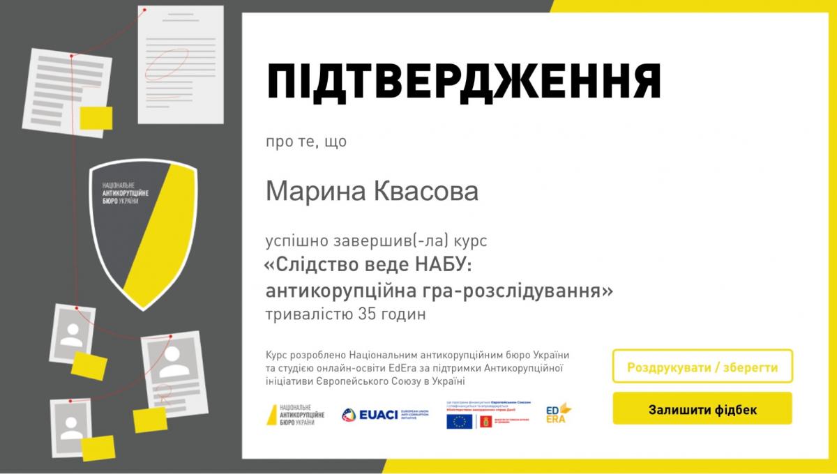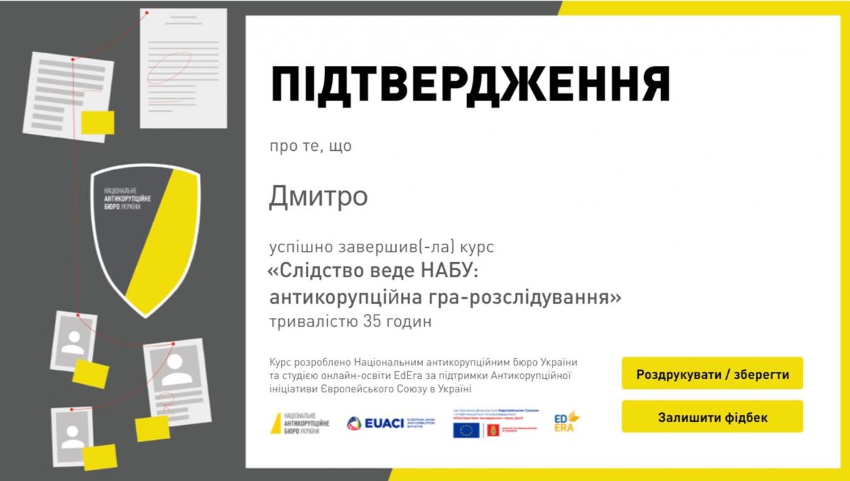 Інтерактивний формат та унікальні матеріали курсу допомогли підвищити знання та навики у викритті незаконних дій чиновників. Кожен етап гри містить відео з порадами від експертів.
