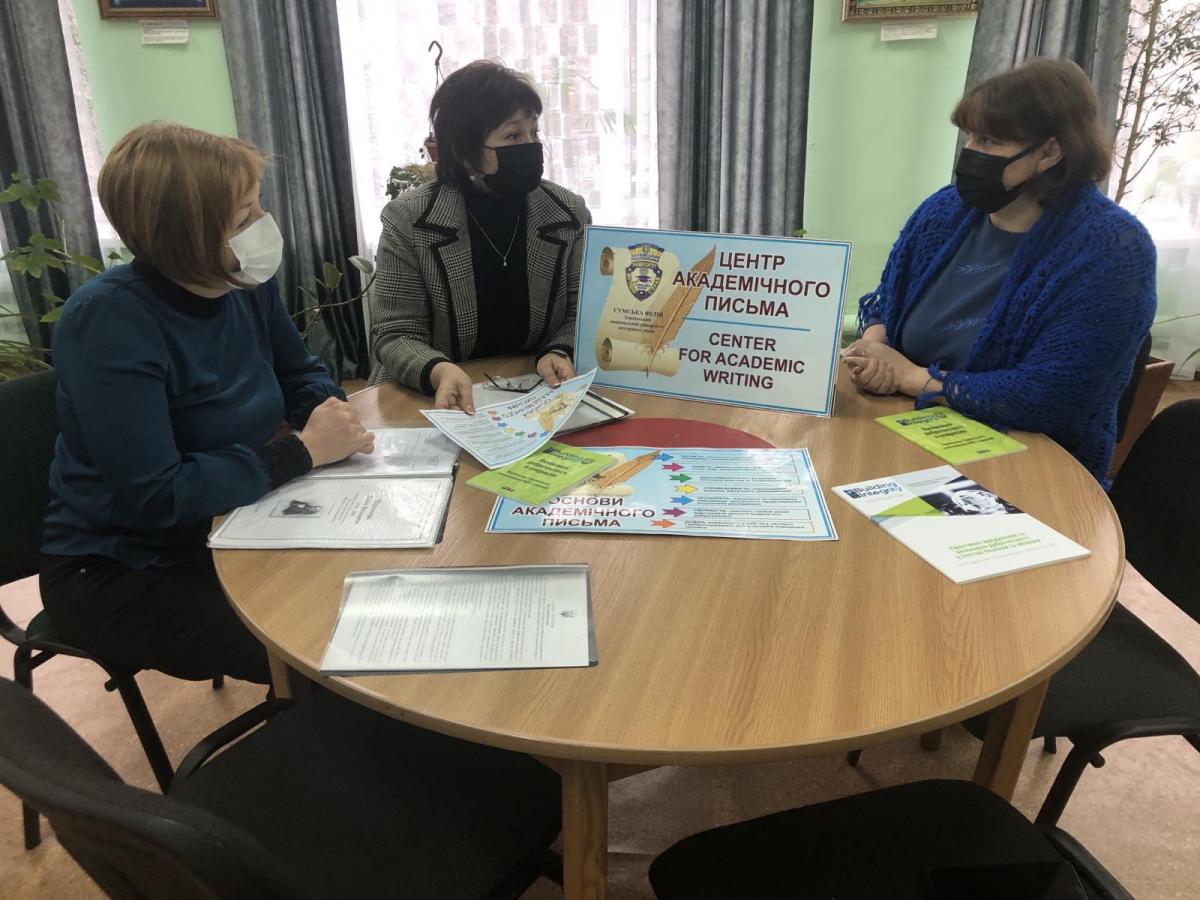 Подальша діяльність Центру академічного письма філії обговорювалась на підсумковому засіданні оргкомітету Центру академічного письма Сумської філії у складі професорки кафедри гуманітарних дисциплін Надії Демиденко (керівника Центру), професорки кафедри юридичних дисциплін Наталії Горобець, завідувачки бібліотеки Сумської філії Світлани Григор’євої. Окрім підведення підсумків роботи Центру за перший семестр 2021-2022 н. р., були окреслені перспективи його діяльності. Зокрема, акцентувалась увага на подальшому забезпеченні перевірки наукових публікацій студентів та викладачів Сумської філії через програму Unicheck.
