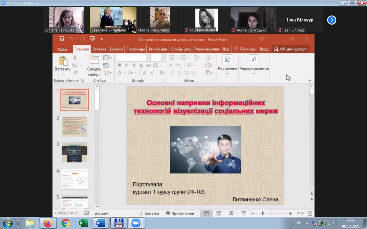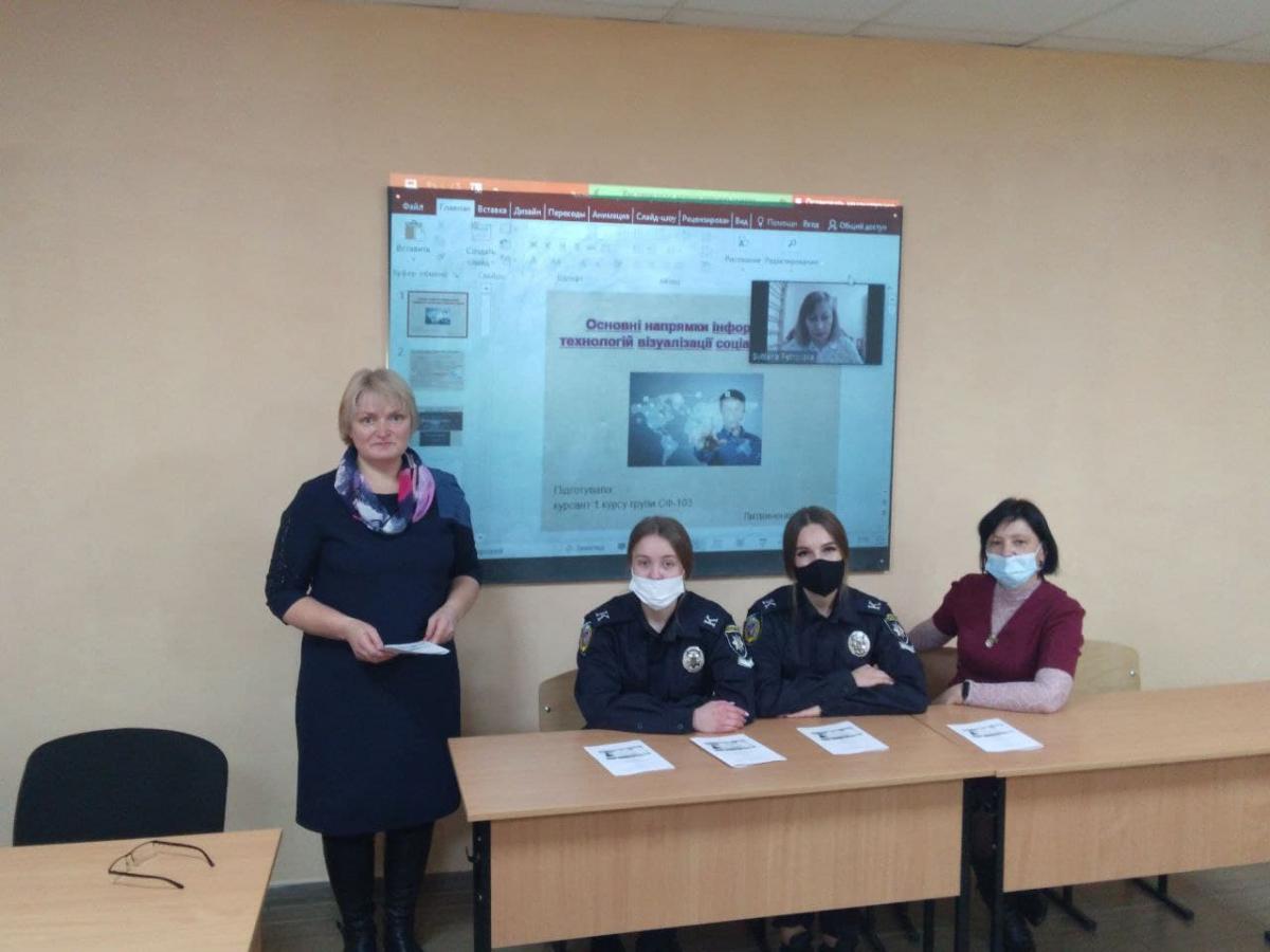 Летвиненко Олена, курсантка 1-го курсу групи СФ-103, з доповіддю на тему «Основні напрямки інформаційних технологій візуалізації соціальних мереж», Новах Мар’я, курсантка 1-го курсу групи СФ-103, з доповіддю на тему «Основні напрямки протидії злочинності у кіберпросторі», Білокур Іван, студент 1-го курсу групи СФдср-21-1 підготував доповідь на тему: «Сучасні ІТ-технології в юридичній діяльності».
