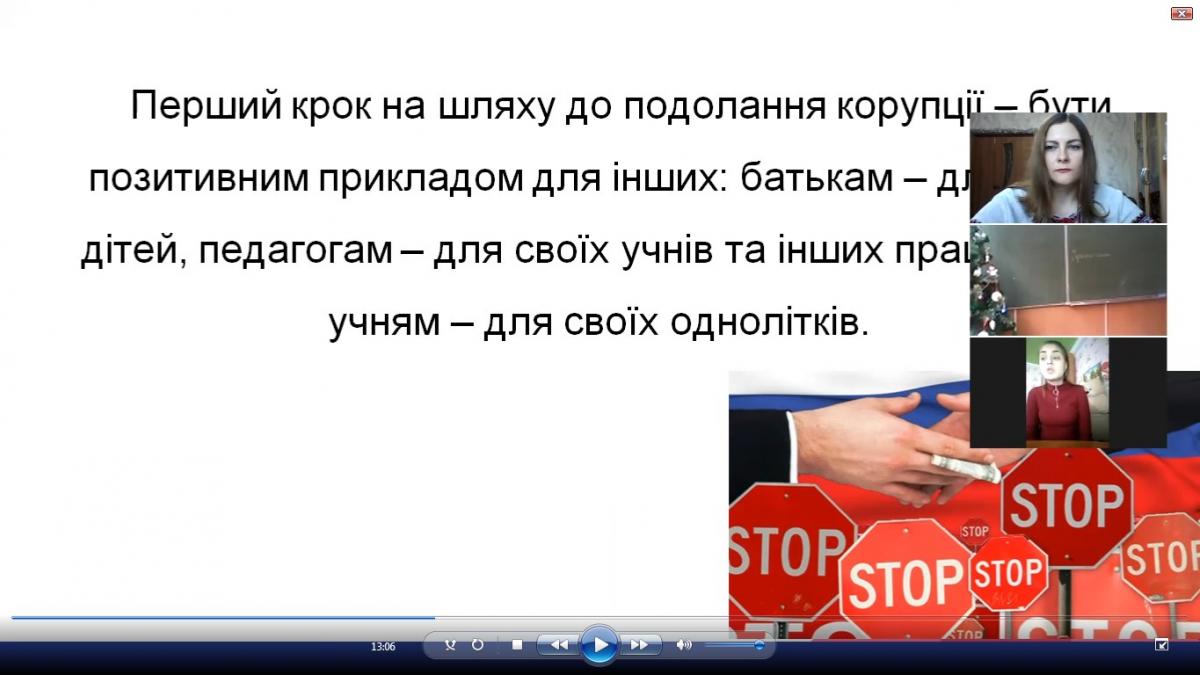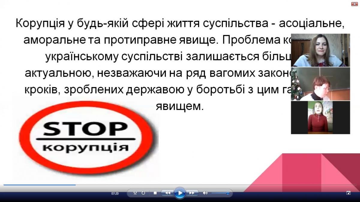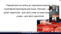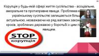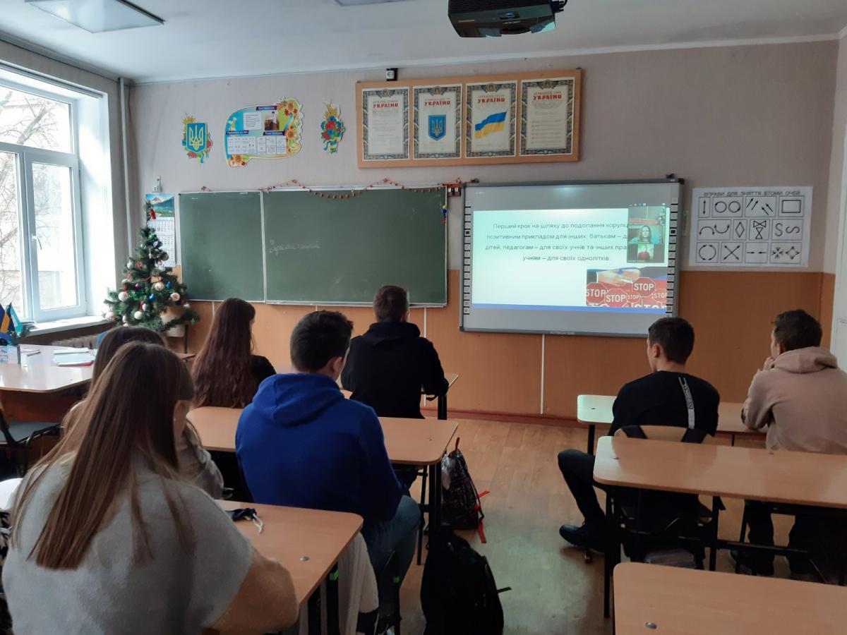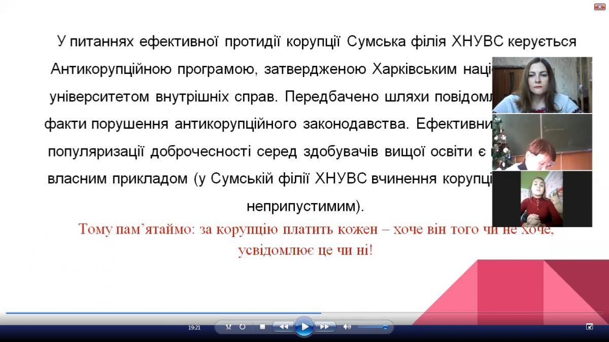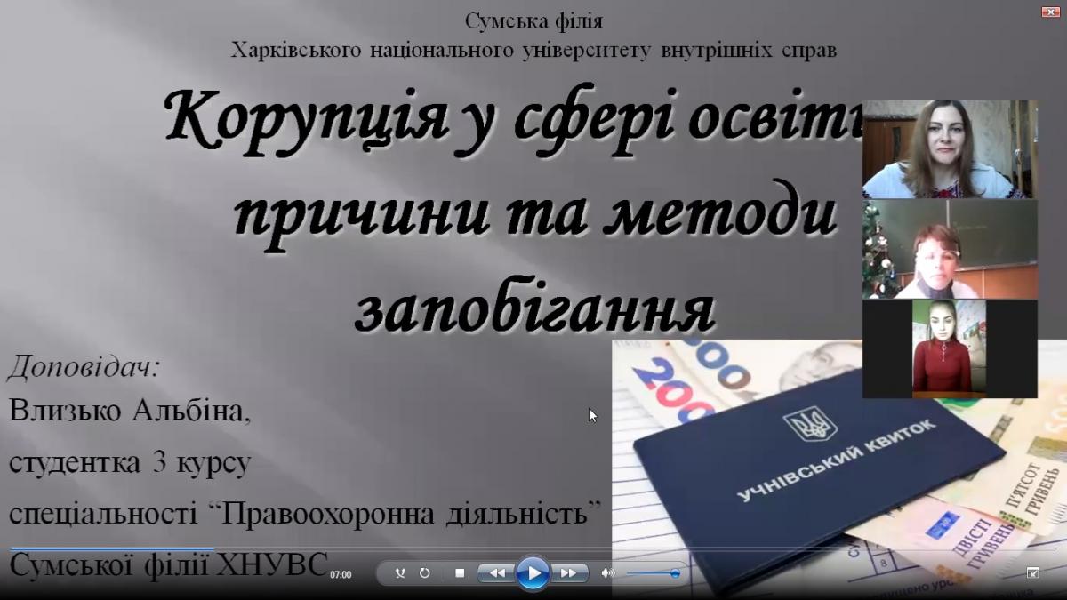 У рамках виконання плану заходів Харківського національного університету внутрішніх справ до Міжнародного дня боротьби з корупцією у 2021 році студентка 3 курсу денної форми навчання спеціальності «Правоохоронна діяльність» Влизько Альбіна під керівництвом доцента кафедри соціально-економічних дисциплін Парфентій Людмили Анатоліївни прочитала для учнів 11 класу Сумської загальноосвітньої школи І-ІІІ ступенів №4 імені Героя України Олександра Аніщенка лекцію на тему «Корупція у сфері освіти: причини і методи запобігання». Було розглянуто причини виникнення корупції у сфері освіти, її масштаби та прояви в освітній системі України, а також окреслено основні напрями антикорупційних заходів як на рівні держави, так і на рівні окремих учасників освітнього процесу.