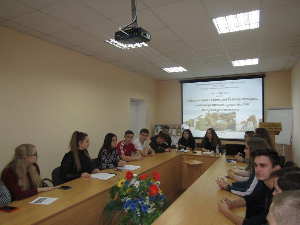 На базі Сумської філії Харківського національного університету внутрішніх справ відбувся круглий стіл «Забезпечення податкової безпеки держави: економіко-правові, організаційні та культурні аспекти», організований завідувачем кафедри соціально-економічних дисциплін Оленою Анатоліївною Лук’янихіною, доцентом кафедри Людмилою Анатоліївною Парфентій, студентами- та курсантами- гуртківцями студентського наукового гуртка «Актуальні проблеми розвитку національної економіки в умовах глобалізації».