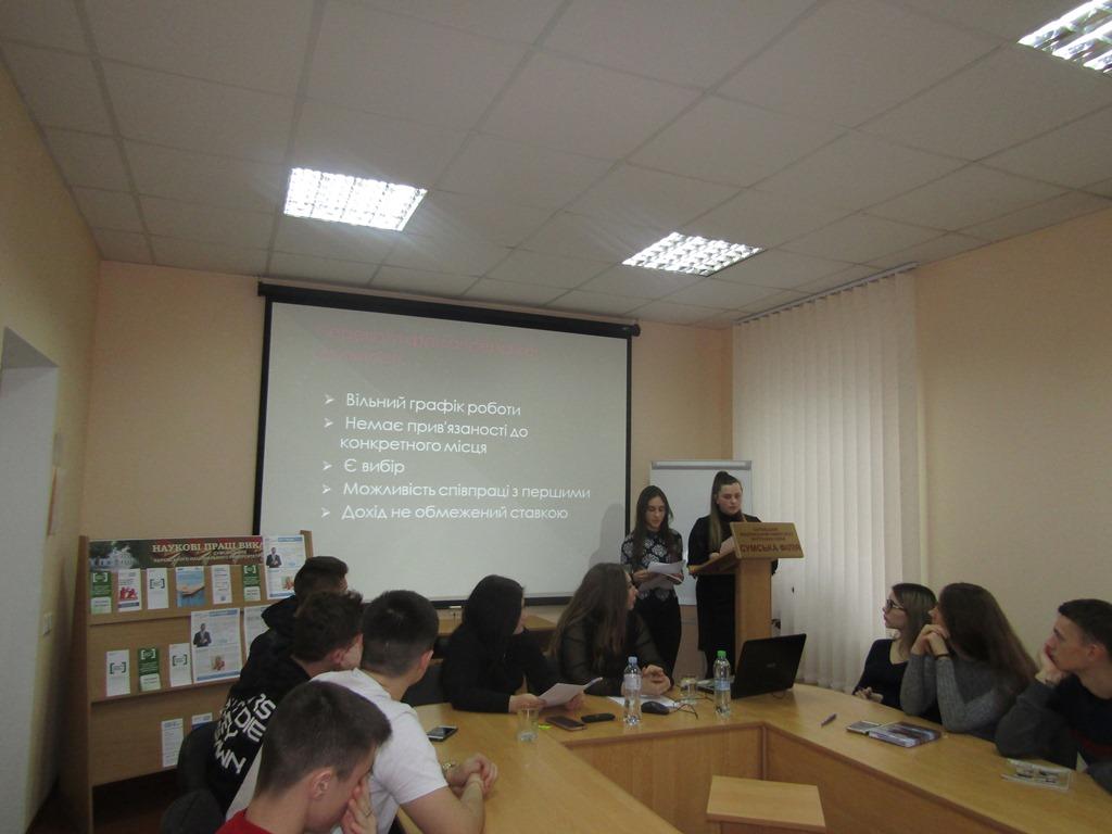 Учасниками круглого столу були обговорені теми, особливо актуальні для нашої держави на сьогоднішній день, а саме: «Податкова безпека держави: основні загрози та сучасний рівень в Україні» (Драновська Карина − студентка 1-го курсу, науковий керівник – к.е.н. Парфентій Л.А.), «Тіньова зайнятість як загроза сталому розвитку економіки України» (Ковтуненко Аліна − студентка 1-го курсу; науковий керівник – к.е.н. Парфентій Л.А.), «Фрілансерська діяльність в Україні: переваги та ризики» (Губська Карина, Заєць Анна − студентки 1-го курсу, науковий керівник – к.е.н. Парфентій Л.А.). Доповіді виявились цікавими та пізнавальними, викликали жваве обговорення у присутніх на заході студентів 1-3-х курсів, курсантів 1-го курсу та викладачів кафедри соціально-економічних дисциплін.