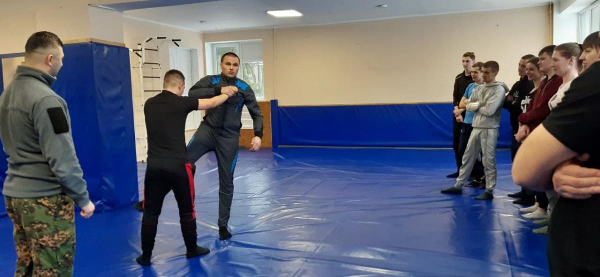 07.02.2022 року викладачами циклу спеціальних дисциплін Сумського центру первинної професійної підготовки «Академія поліції» (м. Суми) Сумської філії ХНУВС старшим лейтенантом поліції Едуардом Кодаком та Вадимом Семеноженком було проведено бінарне заняття з навчальної дисципліни Фізична підготовка (тактика самозахисту) на тему «Захист від нанесення ударів руками та ногами (блоки, больові прийоми)» за участі інструктора відділу професійного навчання УКЗ ГУНП в Сумській області старшого сержанта поліції Максима Юрія.