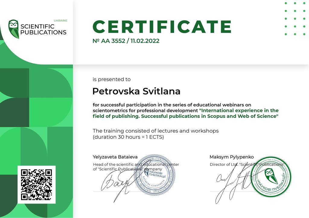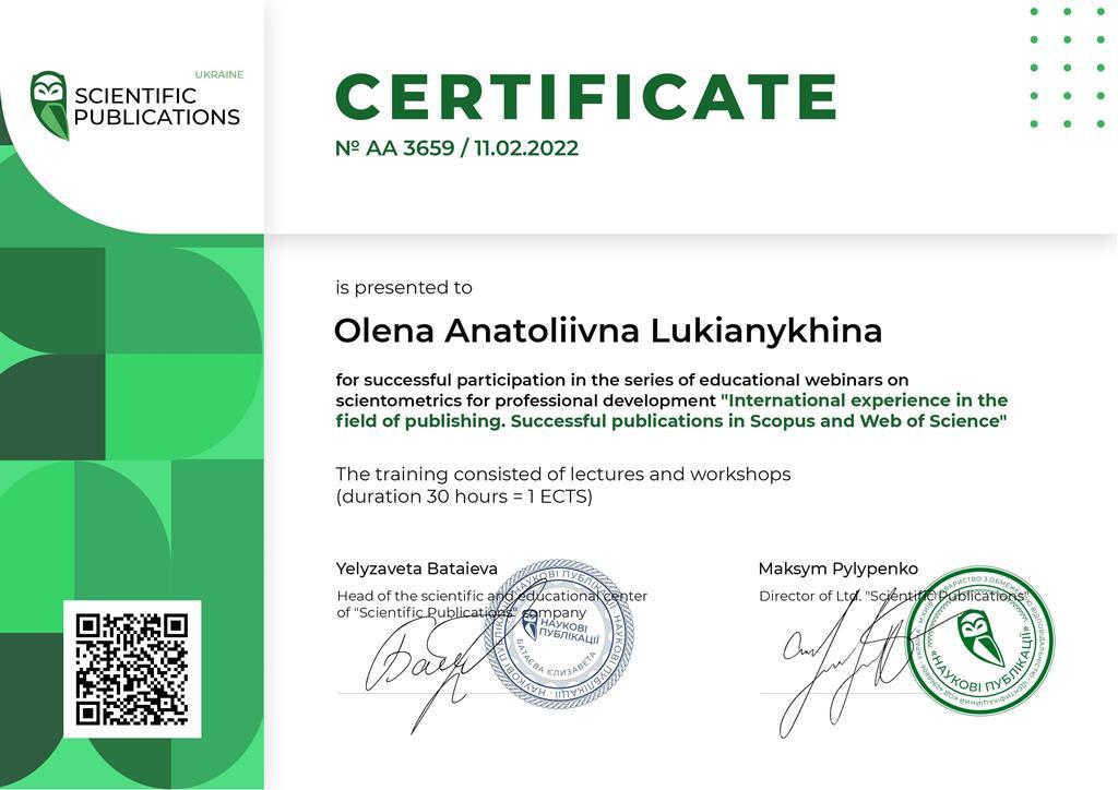 Викладачі кафедри соціально-економічних дисциплін Сумської філії Харківського національного університету внутрішніх справ Олена Лук'янихіна та Світлана Петровська взяли участь у циклі навчальних вебінарів з наукометрії «Міжнародний досвід у публікаційній сфері. Успішні публікації у Scopus та Web of Science», що був проведений компанією «Наукові публікації».