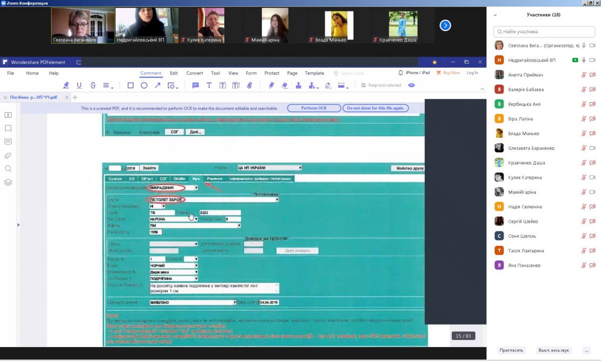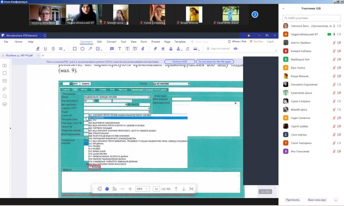 У процесі опрацювання теми слухачі отримали інформацію від практичного працівника національної поліції Наталії Якименко, яка розповіла студентам про використання єдиної інформаційної системи Міністерства внутрішніх справ України, особливості використання Інформаційного порталу Національної поліції України, особливості приймання повідомлень про правопорушення у відділенні, реагування на різні види правопорушень та звітність по реагуванню. Також представник практичних підрозділів наголосила на особливостях ведення Єдиного реєстру досудових розслідувань та складанні Електронних рапортів. Зустріч відбулась у дружній робочій обстановці. Студенти отримали ґрунтовні відповіді на питання, що виникали в процесі теоретичного вивчення та під час виконання практичних завдань у рамках дисципліни, що вивчається.