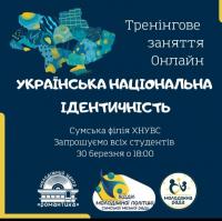 У Сумській філії Харківського національного університету внутрішніх справ було організовано та проведено провідним фахівцем ВКЗ Ганною Мітітєл та діловодом філії Євгенією Думчиковою для студентсько-курсантського самоврядування патріотичний онлайн захід на тему "Українська національна ідентичність" за участі начальника відділу молодіжної політики Сумської міської ради Тетяни Сахнюк, Голови Молодіжної ради при СМР Артема Бондарєва, директора КУ МЦ "Романтика" Світлани Юрченко.