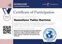 Доцент кафедри гуманітарних дисциплін Сумської філії ХНУВС Юлія САМОЙЛОВА взяла участь у V Міжнародній науково-практичній конференції «Current Issues and Prospects for the Development of Scientific Research», що відбулася у м. Орлеан (Франція). Тема доповіді: «Synchronous and asynchronous format of blended learning as a way of English language training in professional military education institutions and higher education institutions with specific study conditions».