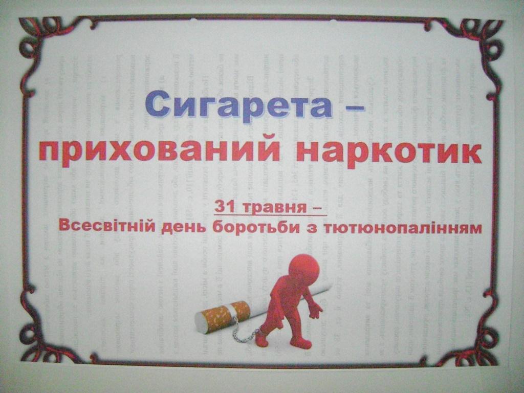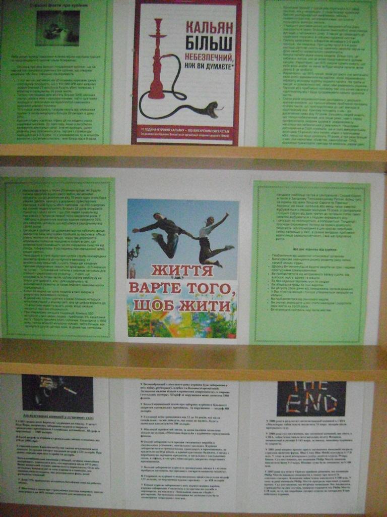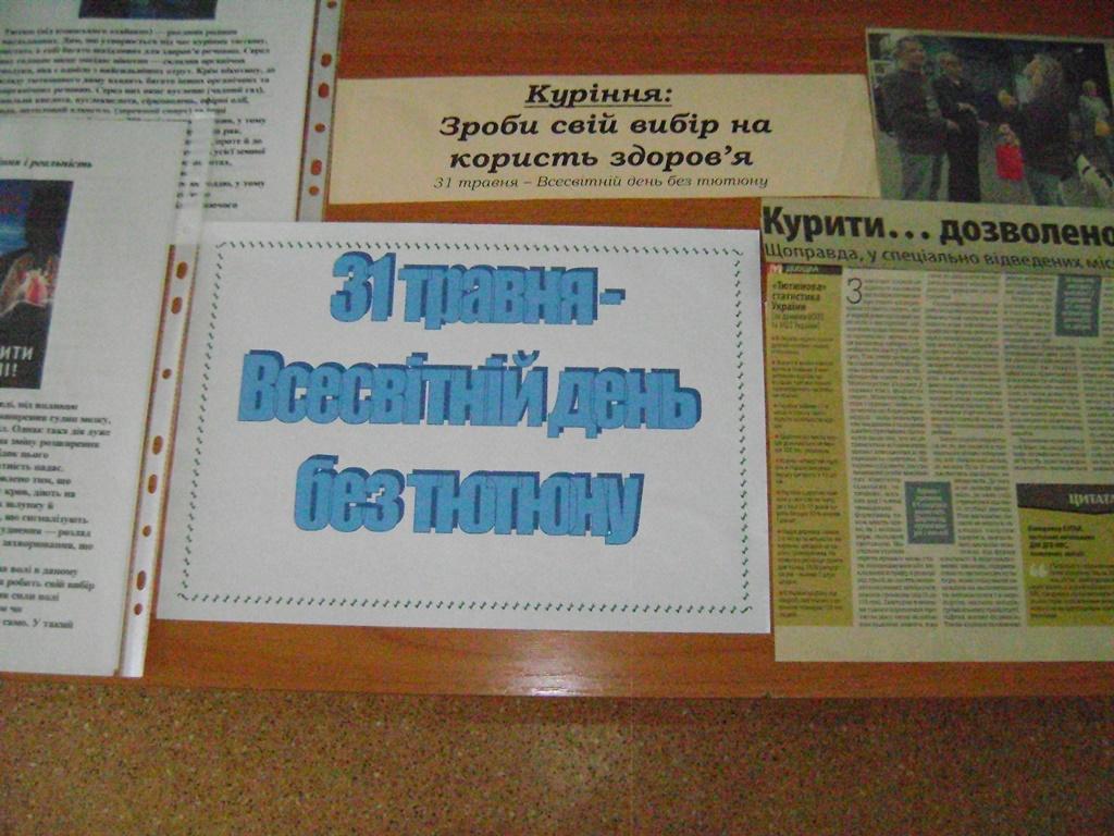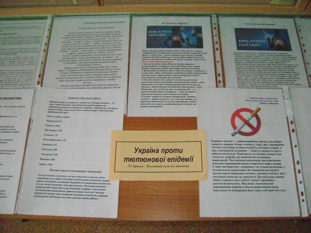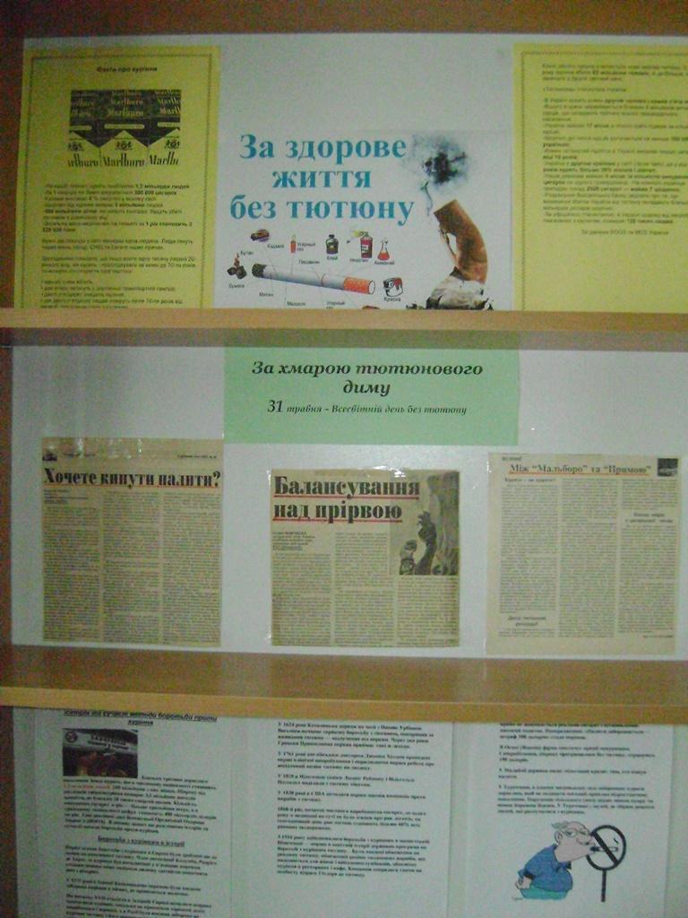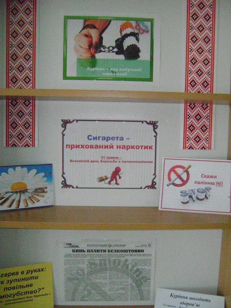 До цієї дати в бібліотеці створено виставку-роздум «Сигарета – прихований наркотик», де представлено різні інформаційні матеріали з даної тематики.