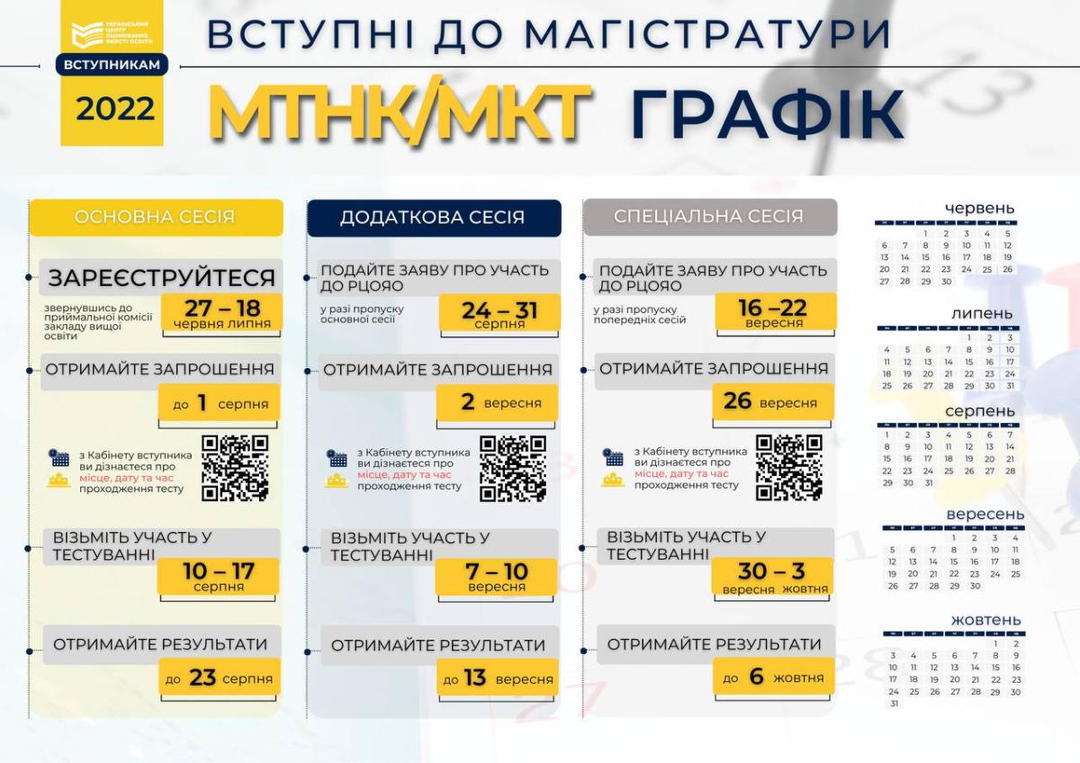 Реєстрація осіб (https://testportal.gov.ua/reyestratsiya-dlya-uchasti-v-mkt-mtnk/), які бажають узяти участь у МКТ та/або МТНК, триватиме з 27 червня до 18 липня включно. Її здійснюватимуть приймальні комісії закладів вищої освіти. Зареєстровані учасники отримають екзаменаційний листок, у якому будуть зазначені дані для здійснення входу на інформаційну сторінку «Кабінет вступника (https://zno.testportal.com.ua/master/login)».