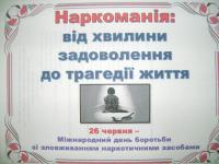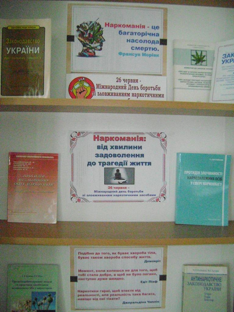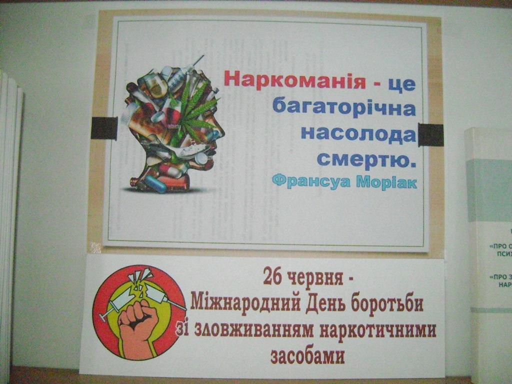 В сучасних умовах великого значення набуває боротьба з наркоманією – потворним явищем, що наносить непоправної шкоди здоров’ю, призводить до деградації особистості, згубно впливає на виховання дітей, на їх майбутнє, наносить надзвичайну матеріальну і моральну шкоду суспільству. Бібліотека долучається до інформаційної роботи з цього питання. В спеціальній читальній залі створено тематичну виставку: «Наркоманія: від хвилини задоволення до трагедії життя», присвячену Міжнародному дню боротьби зі зловживанням наркотичними засобами.