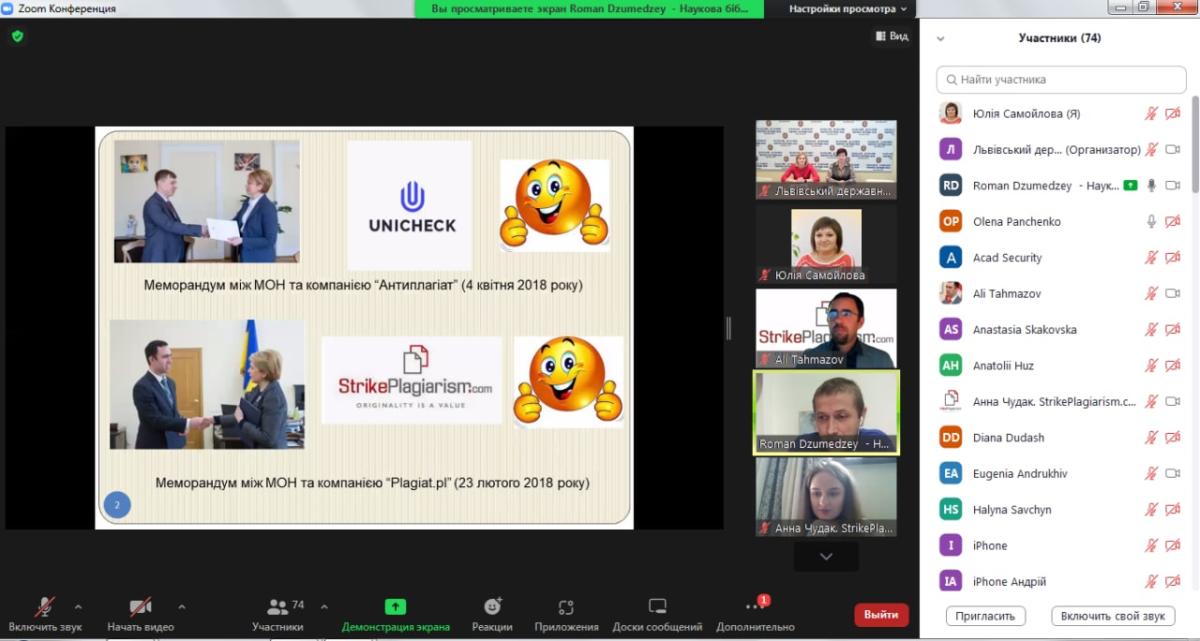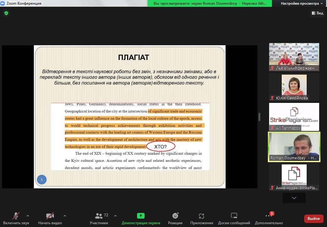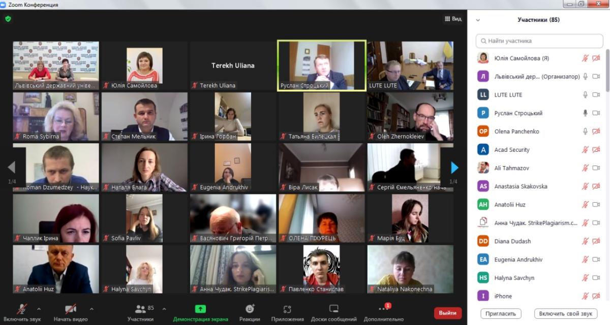 30 вересня 2022 року доцент кафедри гуманітарних дисциплін Юлія САМОЙЛОВА взяла участь у круглому столі на тему «Дотримання академічної доброчесності в закладах вищої освіти», який був проведений на платформі Zoom Львівським державним університетом внутрішніх справ.