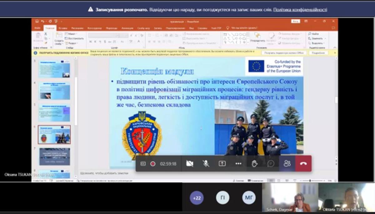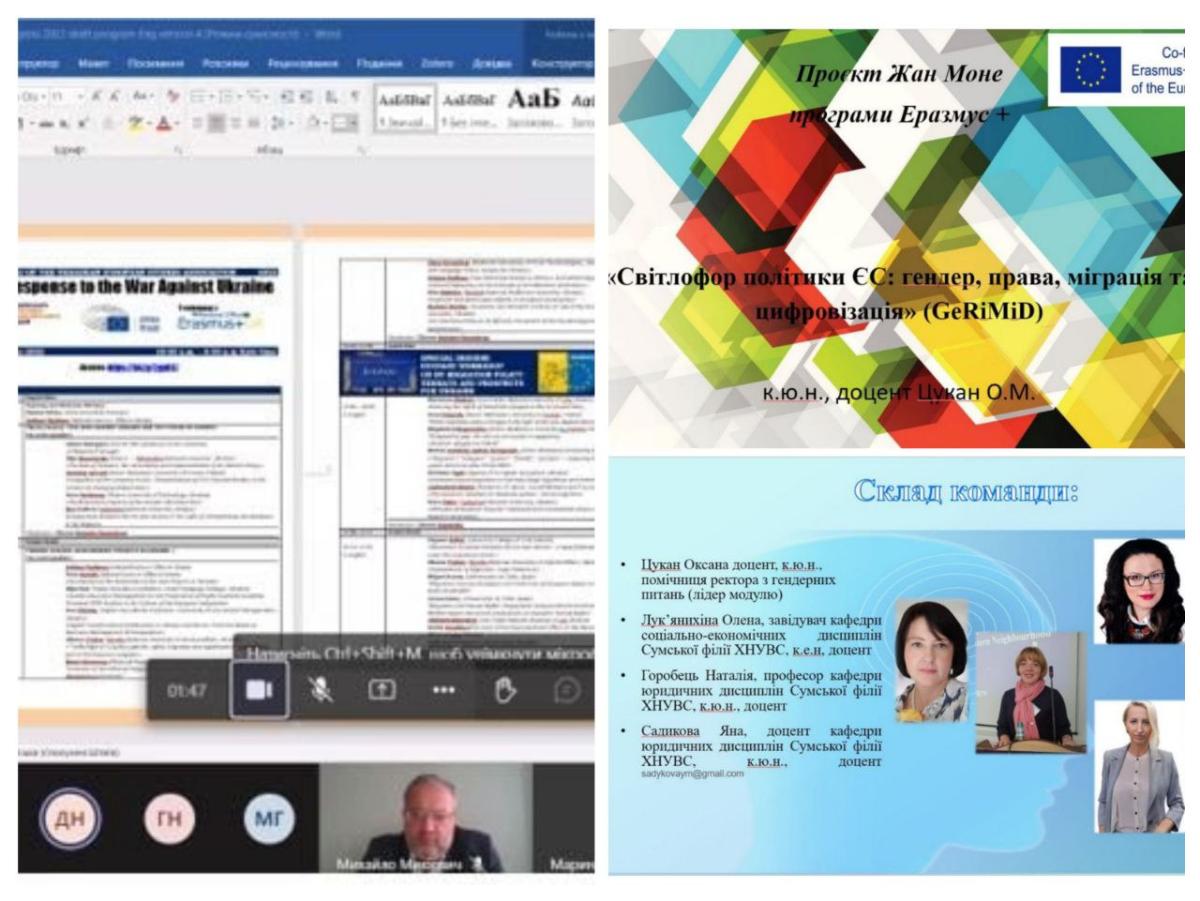 На заході виступила Оксана Цукан, помічниця ректора з гендерних питань ХНУВС, лідерка проєкту Еразмус+ за напрямком Модуль Жан Моне «Світлофор політики ЄС: гендер, права, міграція та цифровізація» (GeRiMiD), в рамках якого вперше серед закладів вищої освіти системи безпеки та оборони здійснюється викладання європейських студій. Вона окреслила основні напрямки і цілі проєкту, а також наголосила на значенні його результатів для суспільства у пошуку і впровадженні недискримінаційних цифрових рішень для міграційних процедур.