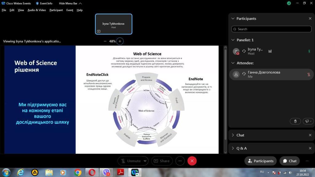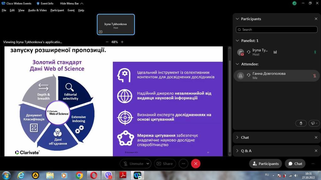 Спікер вебінару, консультантка з регіональних рішень компанії «Clarivate» Ірина Тихонкова наголосила на важливості міждисциплінарних досліджень та академічного науково-дослідного співробітництва, інструментарій для якого пропонує база даних «Web of Science»