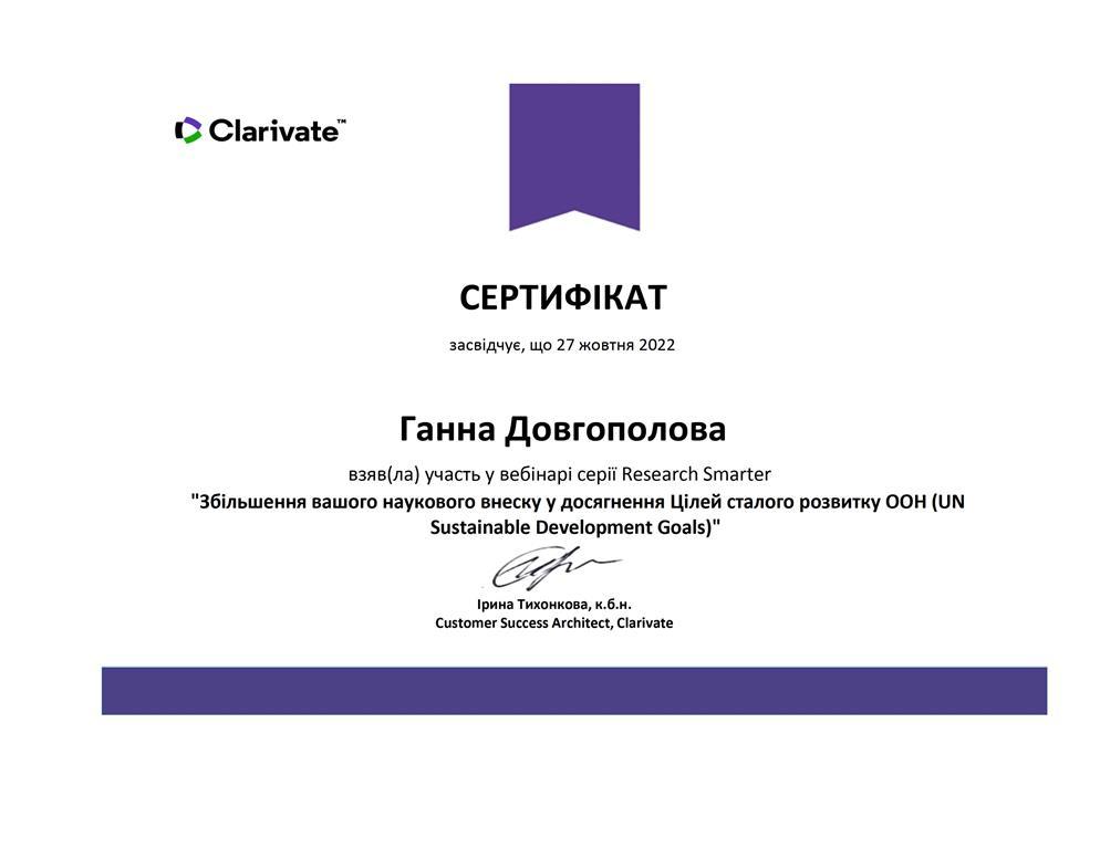 27 жовтня доцент кафедри гуманітарних дисциплін Сумської філії ХНУВС Ганна Довгополова взяла участь у вебінарі для науковців від компанії «Clarivate Analytics». Тема вебірану – «Збільшення наукового внеску у досягнення Цілей сталого розвитку ООН (UN Sustainable Development Goals)». Питання вебінару охопили різні аспекти роботи з базою даних «Web of Science», а також інтеграції Цілей сталого розвитку в наукові дослідження, зокрема: як Web of Science та InCites допоможуть формувати основу для подальших відкриттів за певним напрямом досліджень; як науковцям правильно використовувати дані та інструменти, щоб покращити дослідження, орієнтуючи їх на досягнення Цілей сталого розвитку.