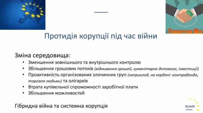 Питання запобігання та протидії корупції набувають особливої актуальності, оскільки в умовах дії воєнного стану корупція є чинником, що може створити реальну загрозу національній безпеці, укріпленню демократії, зміцненню авторитету країни на міжнародній арені та подальшому розвитку держави загалом.
