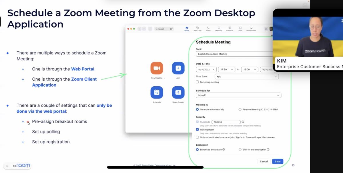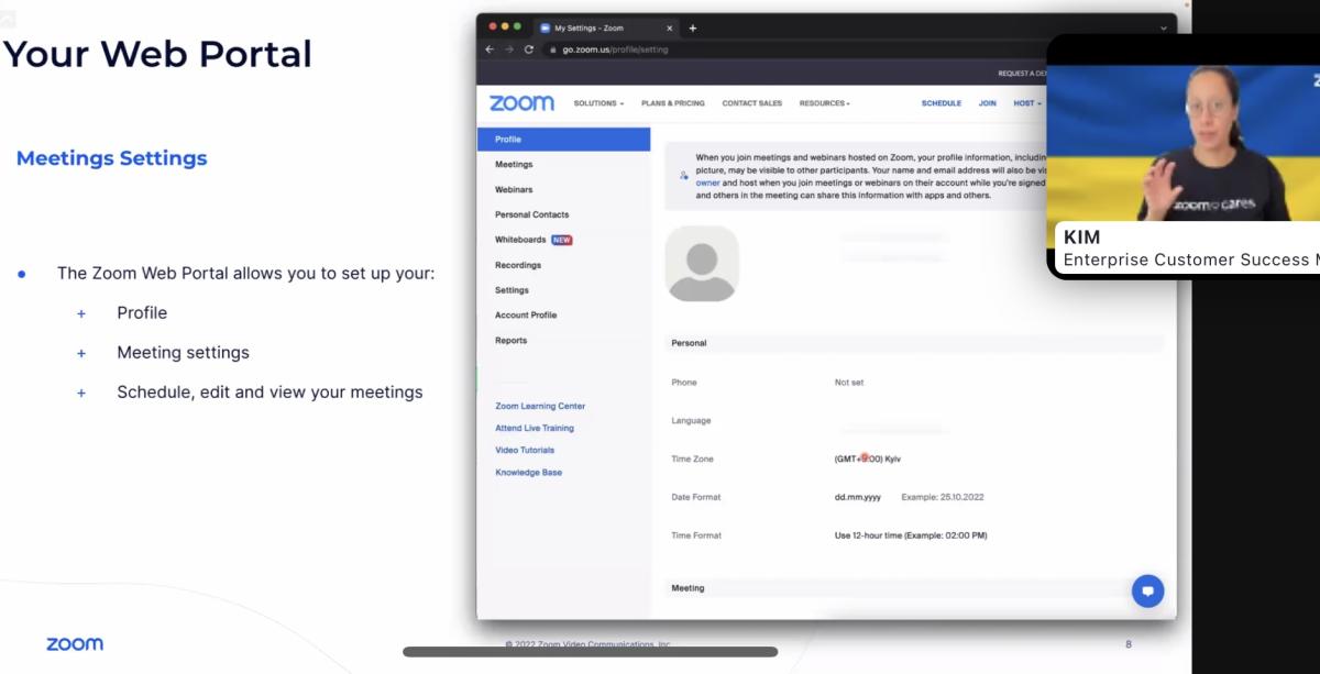 Під час вебінару виступила Kim-Jenny Dinh, Enterprise Customer Success Manager Zoom, яка розповіла наступні питання: можливості ліцензійної версії Zoom; функціональні можливості Zoom Web Portal; функціональні можливості Zoom Desktop Application; налаштування конференції Zoom та Ольга Бершадська, освітня тренерка ГО Вище, викладачка НаУКМА і розповіла про особливості застосування Zoom в університеті.