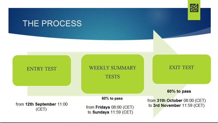 Кожен тиждень був присвячений вивченню певної лексичної теми та повторенню граматики. Окрім того, кожен четвер та п’ятницю проводилися вебінари стосовно розмовних аспектів та граматичної частини. В кінці кожного тижня необхідно було скласти підсумковий тест, який містив завдання на читання, аудіювання, письмо та говоріння.