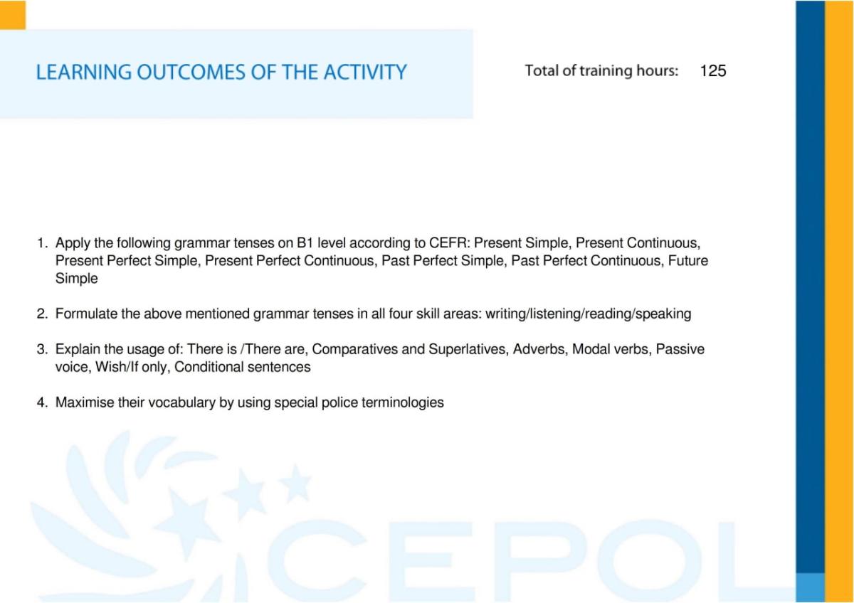 Теми, які були розглянуті на курсі, є наступними: - відділок поліції, спорядження та поліцейські (English Police Station, Equipment and Officers); - відмивання грошей (Money laundering); - кіберзлочинність (Cybercrime); - Європол та групи розслідування (Europol and Investigation Teams); - Шенген (Schengen); - боротьба з тероризмом (Counter Terrorism); - політичний цикл ЄС, імміграція (EU Policy Cycle, Immigration).