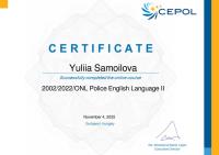 Доцент кафедри гуманітарних дисциплін Сумської філії ХНУВС Юлія Самойлова успішно пройшла 8-тижневий курс вивчення англійської мови для поліцейських «Police English Language», що був організований та проведений Агентством Європейського союзу з підготовки співробітників правоохоронних органів (CEPOL) та Британським мовним центром.