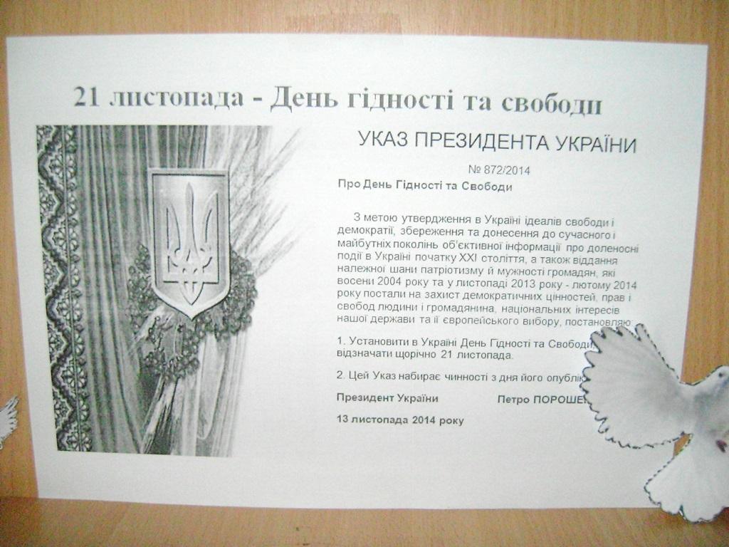 Гідність людини є однією з найважливіших особистісних цінностей, закріплених у багатьох правових актах, у тому числі міжнародних. День Гідності і Свободи став символом боротьби і перемоги, символом єднання заради найвищих ідеалів цивілізованого світу. Всупереч жорстокому тиску антидемократичного режиму українці об’єдналися і відстояли своє право на вибір достойного життя та майбутнього.