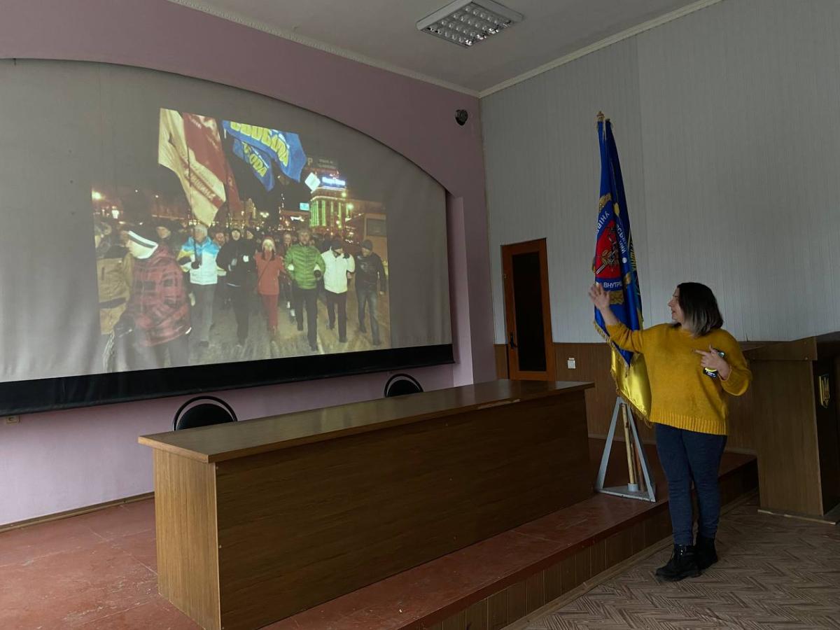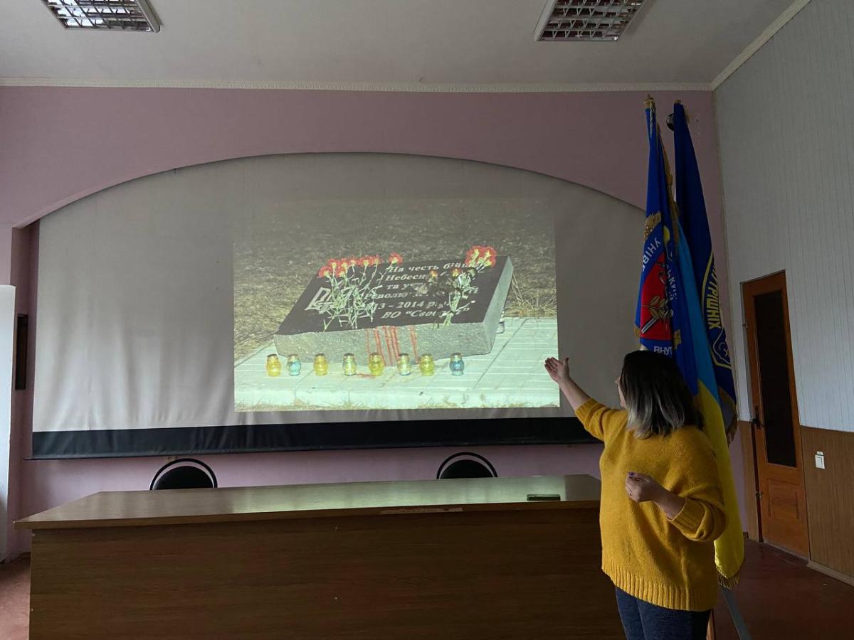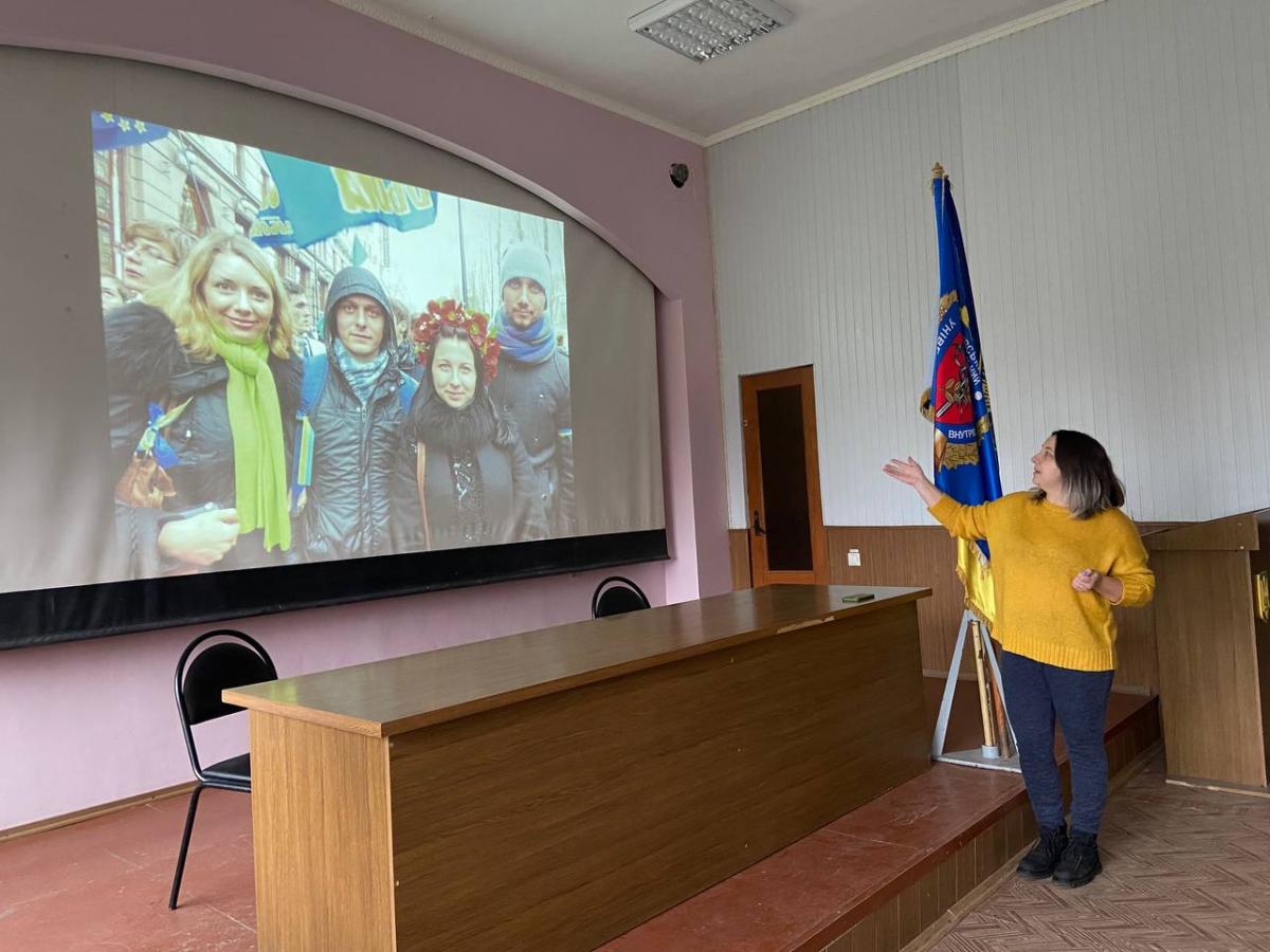 Провідний фахівець із організації виховної роботи Ганна Мітітєл звернулася до курсантів словами: «Це був надзвичайно важкий іспит для України, коли українці продемонстрували свою європейськість, гідність, своє прагнення до свободи, ми повинні з вами пам’ятати ті цінності, які відстоювали учасники українських революцій, та за які сьогодні воюють захисники і захисниці у російсько-українській війні, а саме: незалежність та територіальна цілісність, волю, соборність, гідність України та українців».