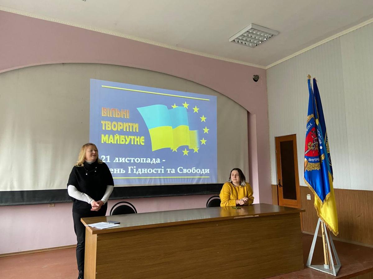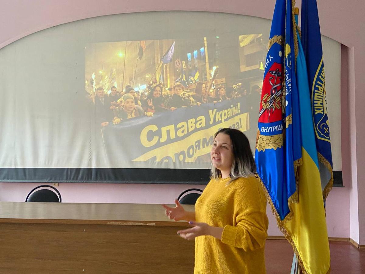 З метою вшанування пам’яті про події Революції Гідності, пам’яті про загиблих у відстоюванні права українців на Гідність та Свободу було проведено для студентсько-курсантської молоді Сумської філії Харківського національного університету внутрішніх справ виховну годину «Україна – країна нескорених», за участі директорки Агенції Промоції «Суми», учасниці Революції Гідності та Свободи Юлії Левченко. У своїй презентації пані Юлія продемонструвала незламний дух українського народу у цій боротьбі. «Революція відбулася не лише в політичному житті країни, а вона відбулась у нас самих, у нашій свідомості, адже, Україна – це територія Гідності і Свободи. Такими нас зробили не одна, а дві революції – наш Майдан 2004 року, який був Святом Свободи, і Революція 2013 року, Революція Гідності»,- наголосила Юлія Левченко.