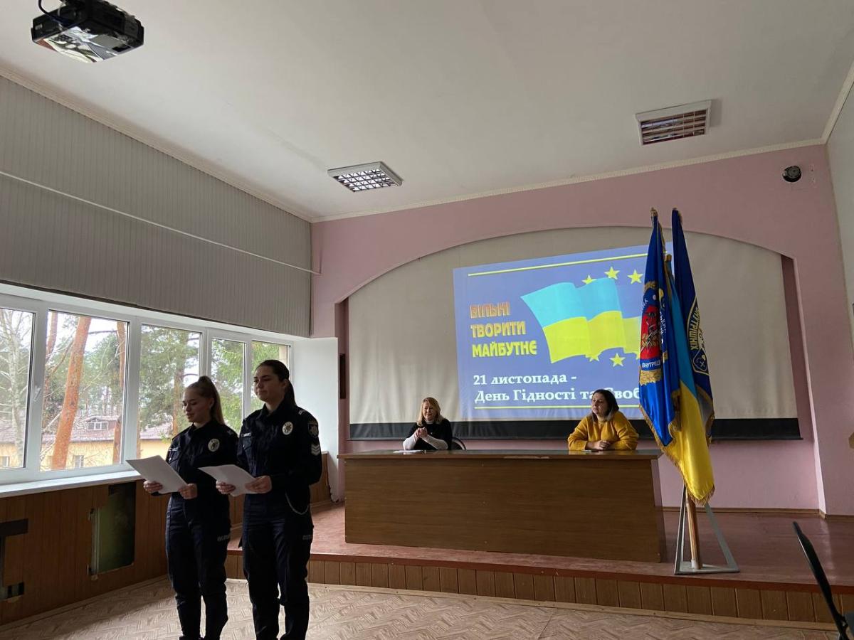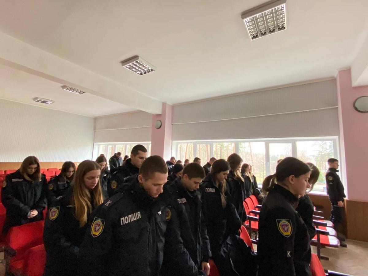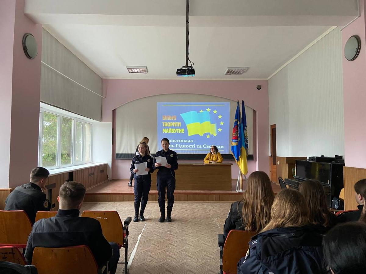 Курсанти 3 курсу Єлизавета Шевцова та Марина Шака також підготували спогади про події, які відбувалися в країні у 2004 році і на Майдані Незалежності у 2013-2014 роках. Вони разом із курсантами хвилиною мовчання вшанували усіх загиблих під час Революції Гідності.