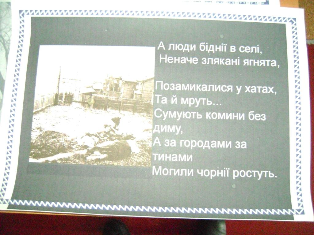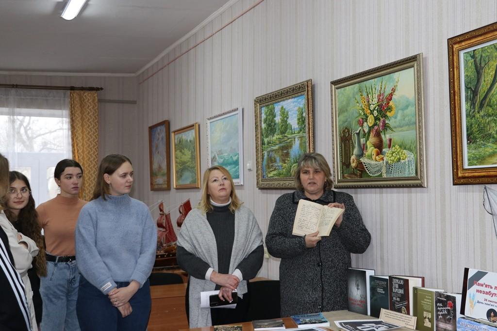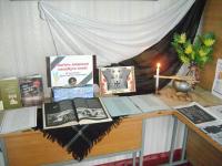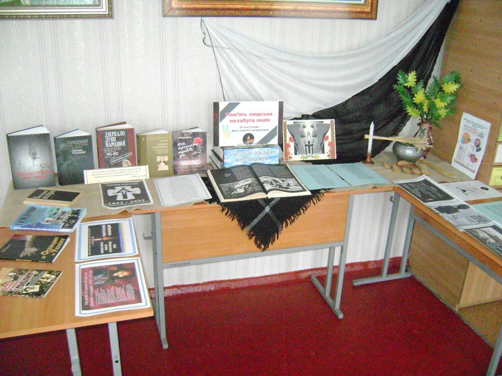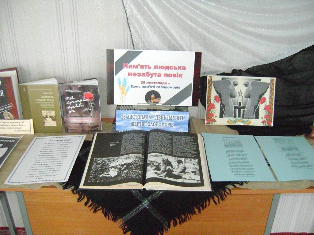 Згідно цієї скорботної дати в бібліотеці організована книжкова виставка «Пам’ять людська незабута повік». На виставці представлені збірники матеріалів наукових конференцій, мемуари в’язнів нацистських таборів Освенціму та Ебензе, збірник вибірки матеріалів з кримінальної справи №475, яка налічуює 331 том і зберігається в поточному архіві Апеляційного суду м. Києва, збірник документів із джерелами з історії голодомору 1932 – 1933 рр. які зберігаються за межами України, а також монографії, документальні розповіді, Книга-Меморіал «Голод 33» та інформаційні матеріали. Всі ці видання інформують про передумови виникнення голодоморів в Україні, які основані на беззаперечних архівних документах і свідченнях багатьох учасників жахливих подій 30 – х років, слугують доказом геноциду українського народу – світової трагедії 20 століття.