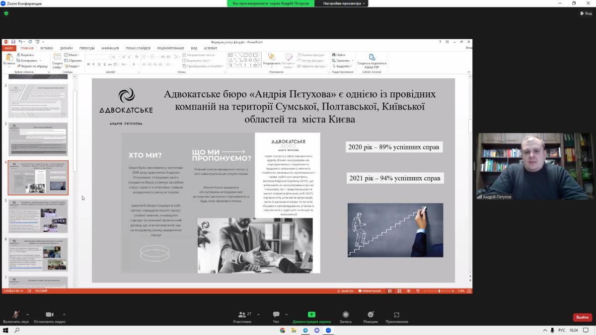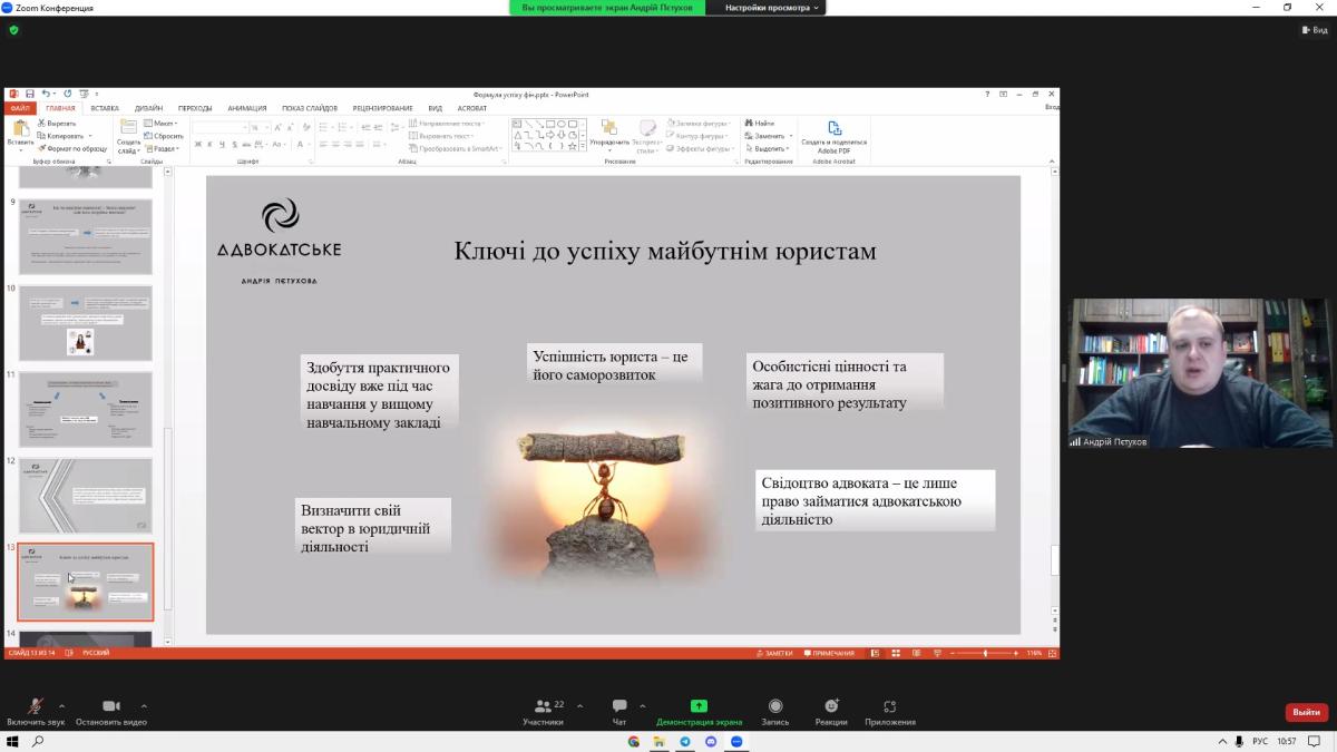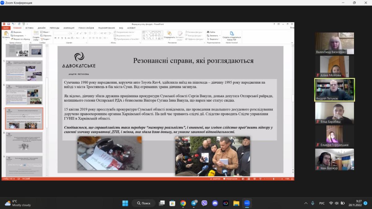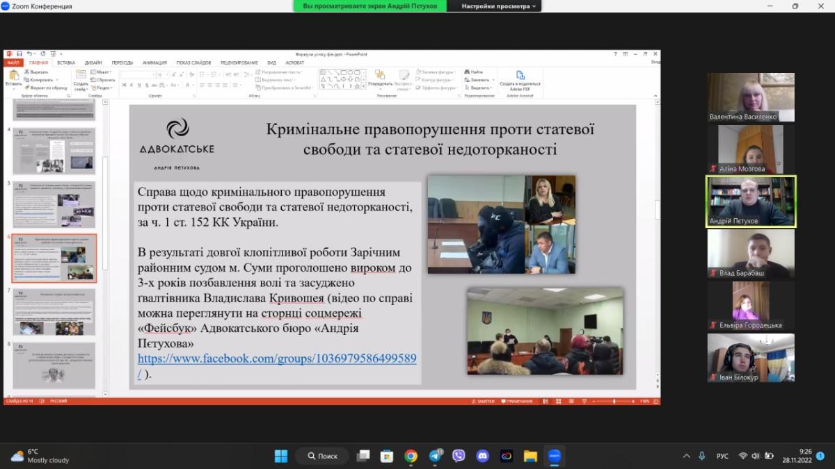 Як дотримуватись мовленнєвого етикету під час спілкування з постраждалими від насильства обговорили 28 листопада 2022 року на бінарному занятті з навчальної дисципліни «Українська мова професійного спрямування» зі здобувачами 1 та 2 курсу спеціальностей «Право» та «Правоохоронна діяльність» Сумської філії ХНУВС у рамках проведення міжнародної кампанії «16 днів активізму проти ґендерно зумовленого насильства» в Україні за участі адвоката, керуючого Адвокатського бюро «Андрія Пєтухова», керуючого партнера Адвокатського об’єднання «ЮРРАЙТ», к.юрид.н. Андрія ПЄТУХОВА та завідувача кафедри гуманітарних дисциплін Валентини ВАСИЛЕНКО