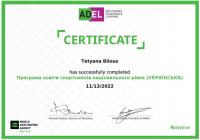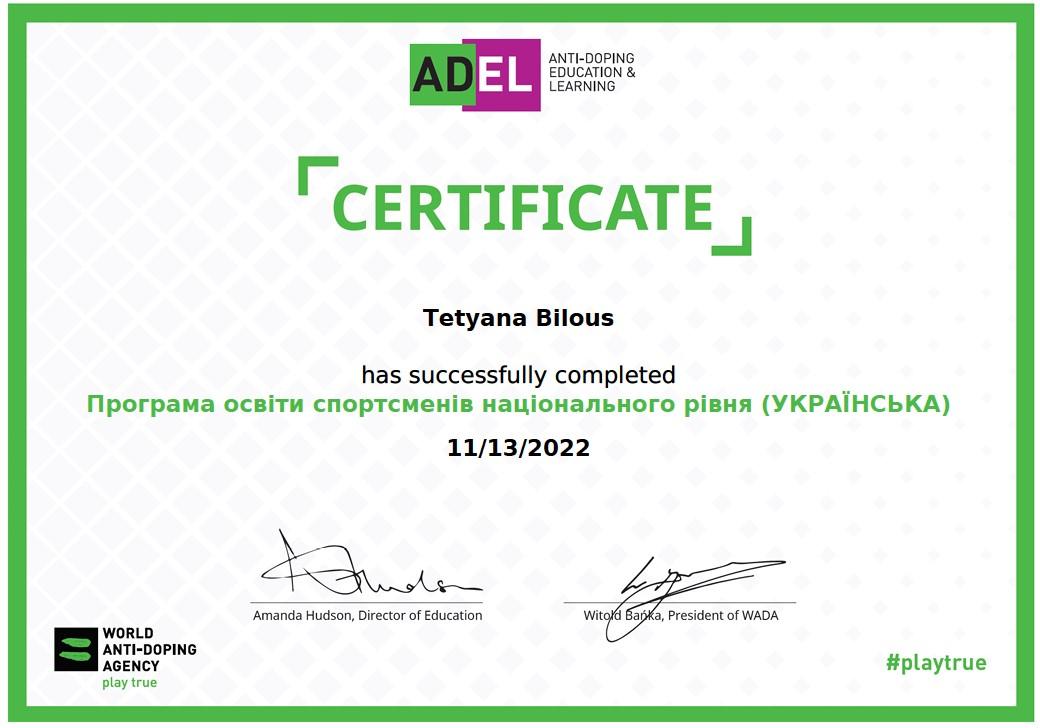 Доцентка кафедри гуманітарних дисциплін Сумської філії Харківського національного університету внутрішніх справ, канд. пед. наук, доцент Тетяна БІЛОУС пройшла базовий курс антидопінгового навчання (12 модулів) у форматі онлайн на платформі ADEL Всесвітньої антидопінгової агенції WADA. Кожен модуль розглядає конкретну тему про антидопінг.