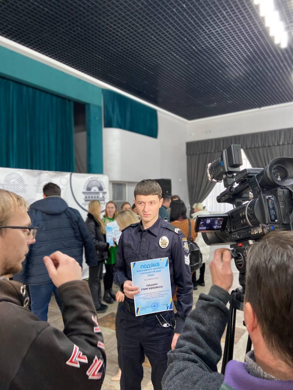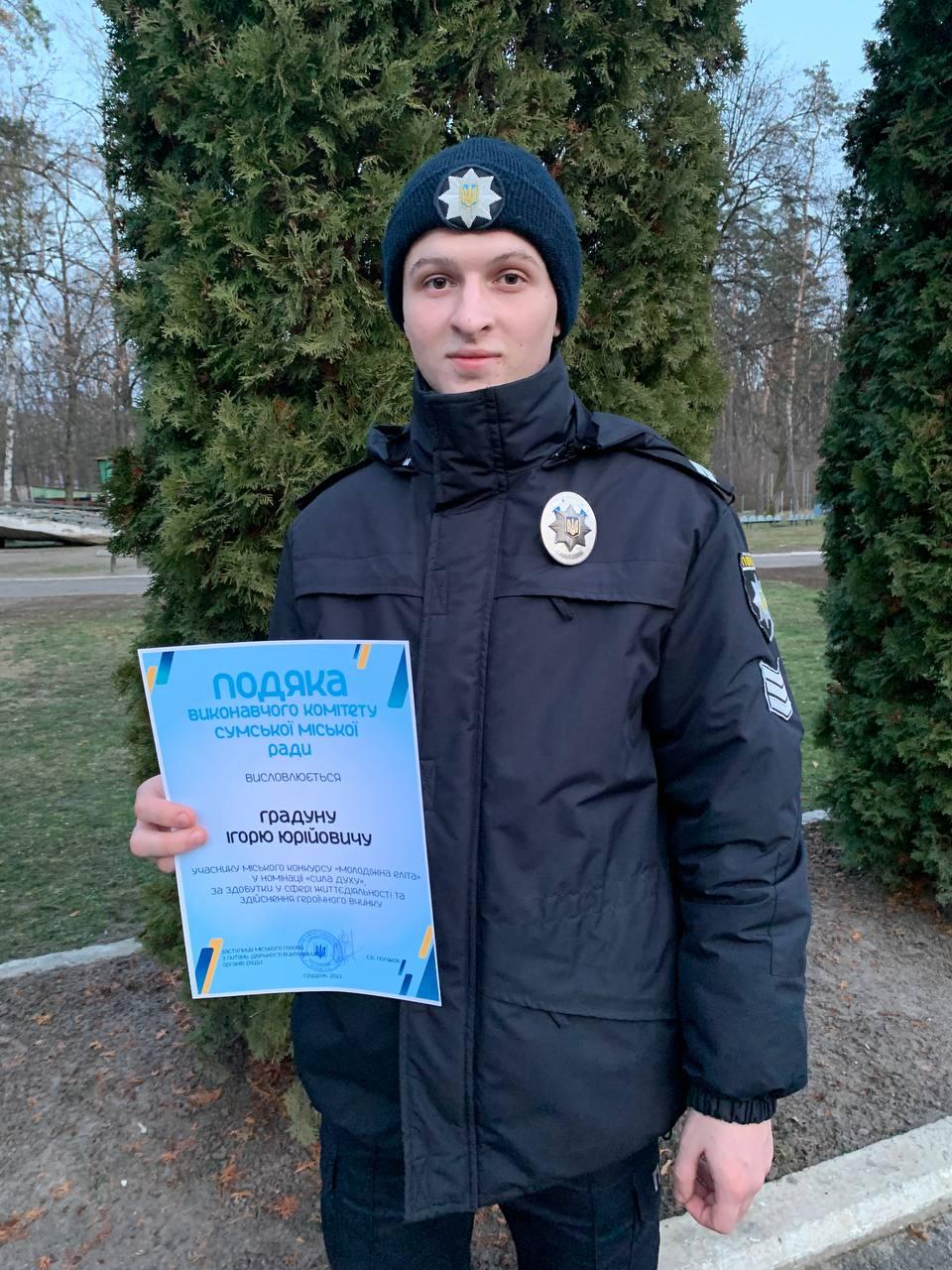 Курсант 3 курсу Сумської філії Харківського національного університету внутрішніх справ капрал поліції Ігор Градун був учасником міського конкурсу "Молодіжна еліта" в номінації "Сила духу". За здобутки у сфері життєдіяльності та здійснення героїчного вчинку Ігор відзначений Подякою виконавчого комітету Сумської міської ради.