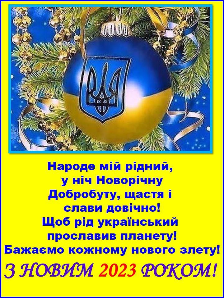 З Новим 2023 роком! Нехай він видасться переможним у всіх сенсах: для нашої України – над ворогом, для всіх людей – над тими стражданнями, які принесли окупанти на нашу землю. Бажаємо, щоб рік новий дарував тільки позитивні емоції. Щоб всі ті добрі мрії й бажання втілились у життя, а попереду чекала тільки чиста дорога до світлого майбутнього.