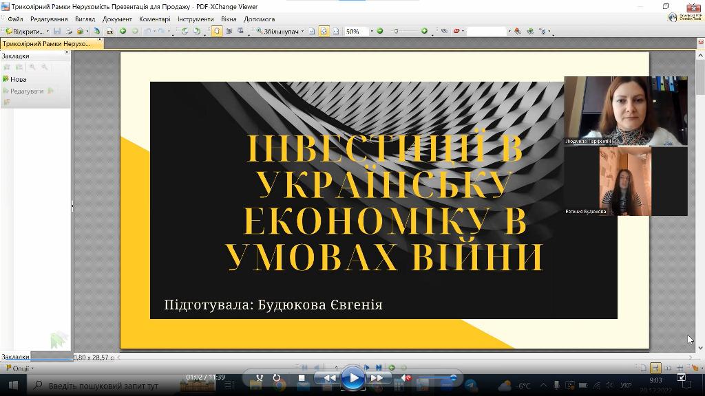 На початку засідання зі вступним словом до студентів-гуртківців звернулася керівниця секції канд. екон. наук Парфентій Людмила Анатоліївна. Після цього з доповіддю на тему «Інвестиції в українську економіку в умовах війни» виступила студентка 4 курсу спеціальності 081 Право Будюкова Євгенія (науковий керівник - канд. екон. наук Парфентій Людмила Анатоліївна).
