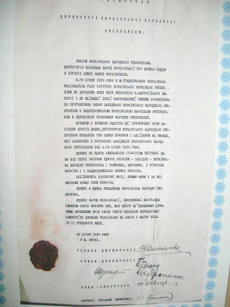 «Віднині зливаються в одне ціле віками розділені частини України - Галичина, Буковина, Закарпаття та Придніпрянська Україна – в одну велику Україну. Віднині є одна незалежна Українська Народна Республіка», - так було написано в Акті злуки.