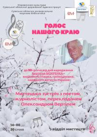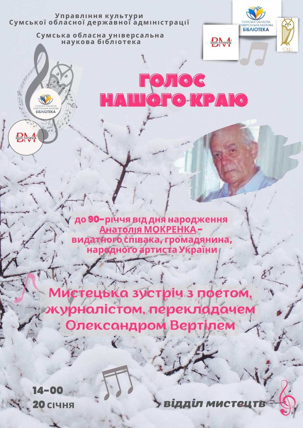 З метою патріотичного та художнього-естетичного виховання молоді для курсантів 1 курсу Сумської філії Харківського національного університету внутрішні справ було організовано та проведено мистецьку зустріч із поетом, перекладачем, заслуженим журналістом України Олександром Вертілем. Зустріч під гаслом «Голос нашого краю» відбулася у відділі мистецтв Сумської обласної універсальної наукової бібліотеки з нагоди відзначення 90-річчя від дня народження видатного українського співака, народного артиста України, лауреата Шевченківської премії, нашого земляка Анатолія Мокренка (1933–2020).