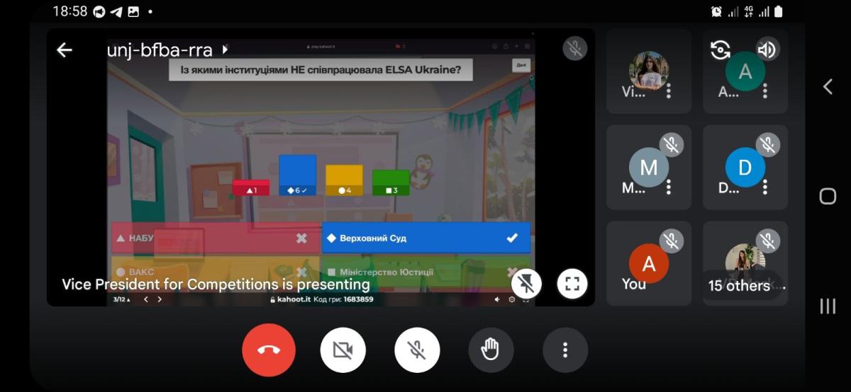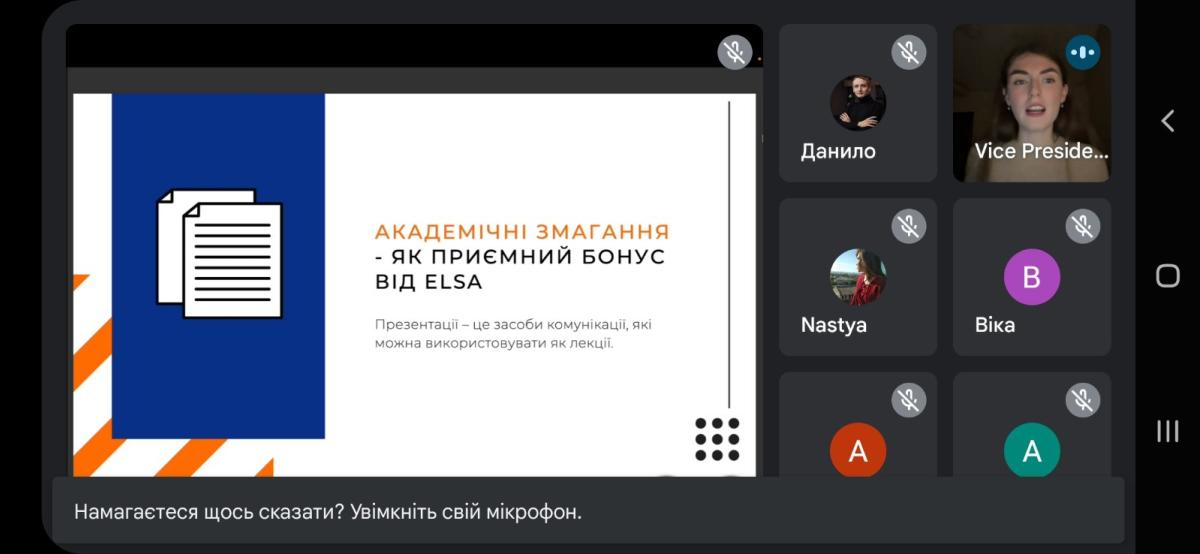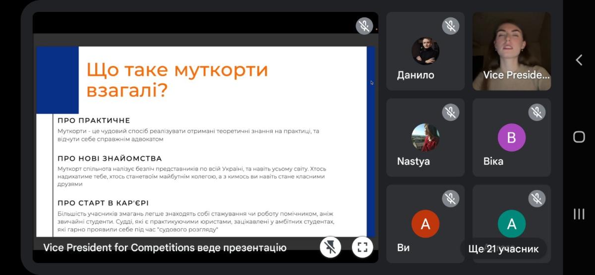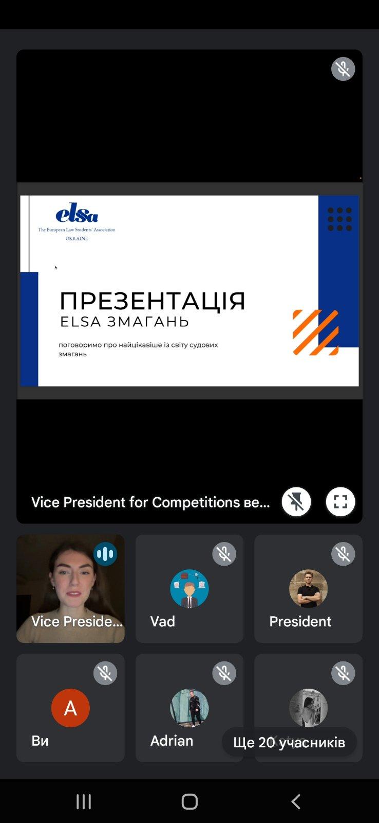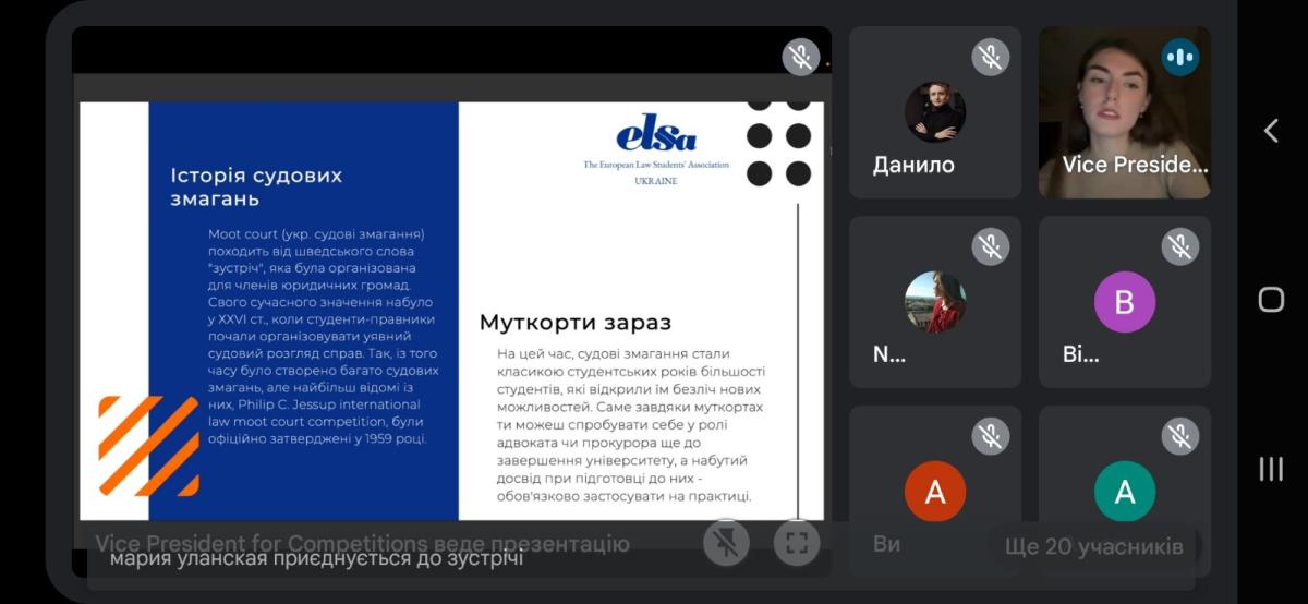 Учасники ELSA Sumy взяли участь у презентації ELSA змагань, що відбулася 23 січня в онлайн форматі. Темою просвітницької зустрічі студентів-правників, яку провела віцепрезидентка зі змагань ELSA Ukraine Юлія Костів, стали мут-корти.