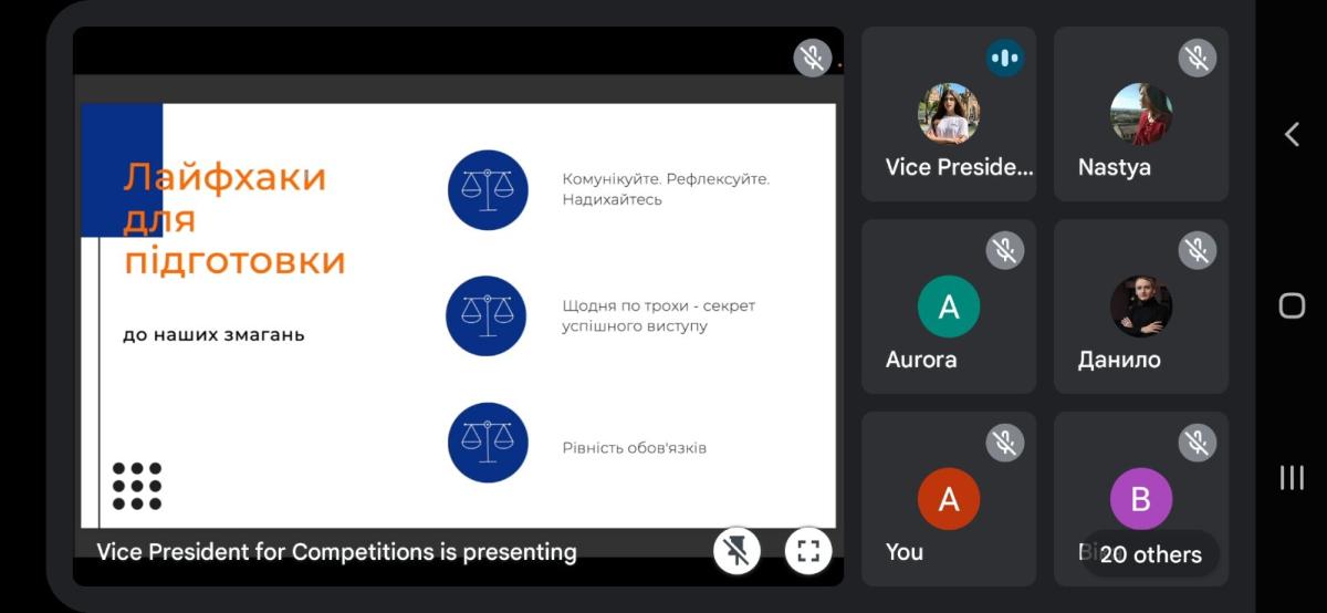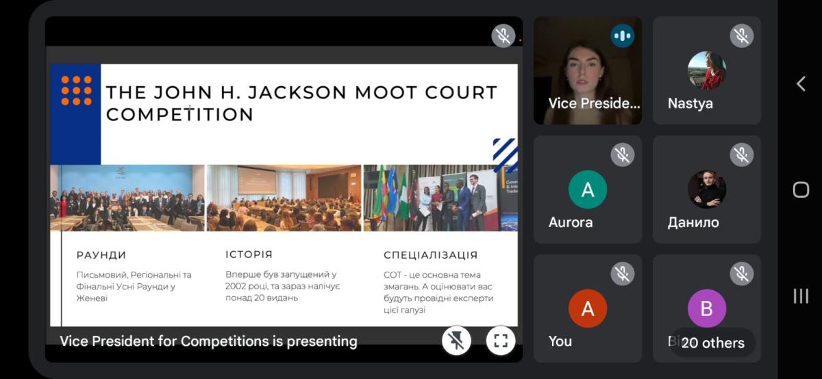 Зокрема, студенти сумського осередку ELSA дізналися, що мут-корт (moot court) – це симульовані судові дебати для студентів, на яких команди розбирають кейс із певної сфери права, після чого готують позиції позивача та відповідача в письмовому форматі, а також презентують свої позиції усно. Учасники зустрічі отримали короткий екскурс в історію мут-кортів, а також практичну інформацію щодо того, як обрати змагання, де їх можна знайти, які змагання існують в мережі ELSA, чому варто взяти в них участь та поради щодо підготовки.