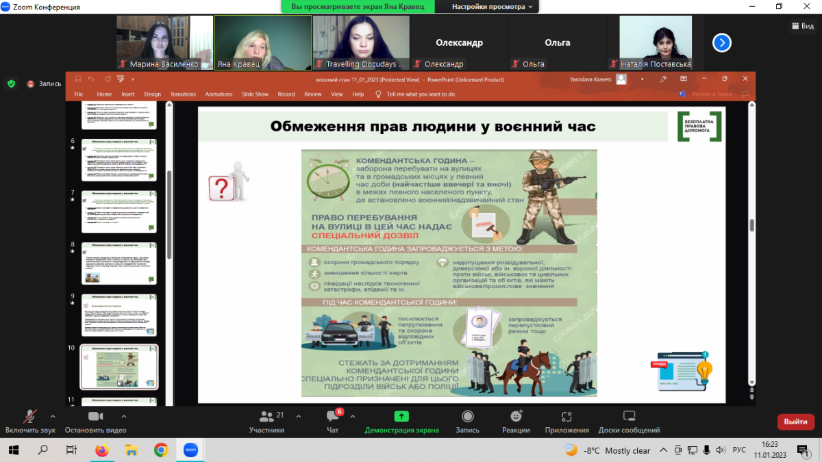 Також фахівчиня розповіла стосовно комендантської години, її порядку введення та обмеження, які встановлюються.