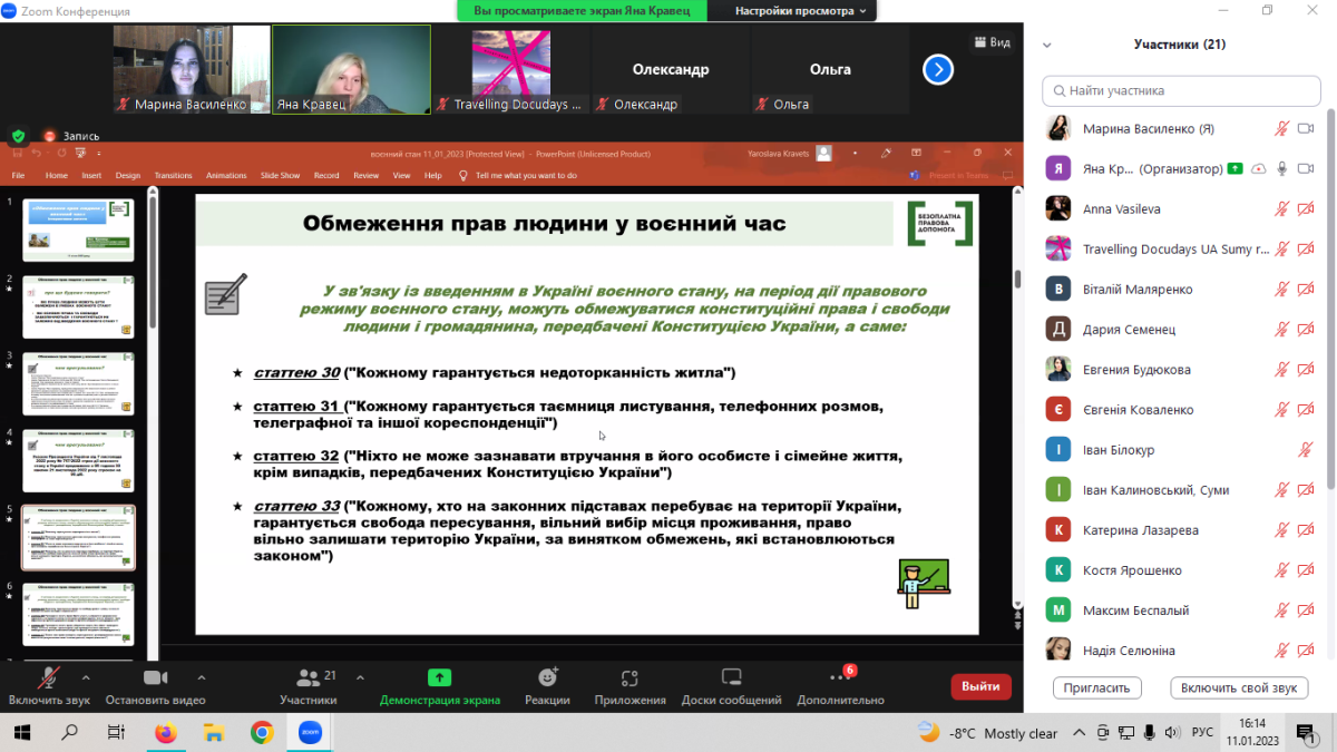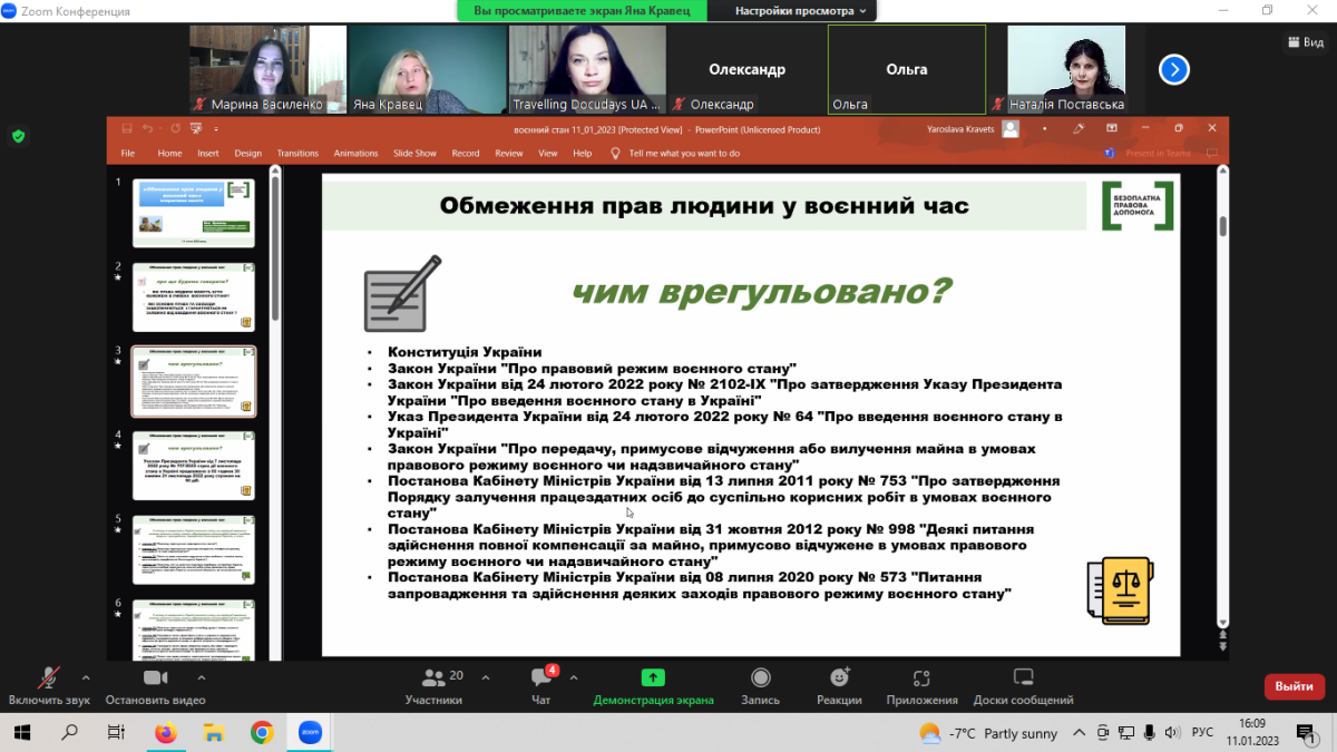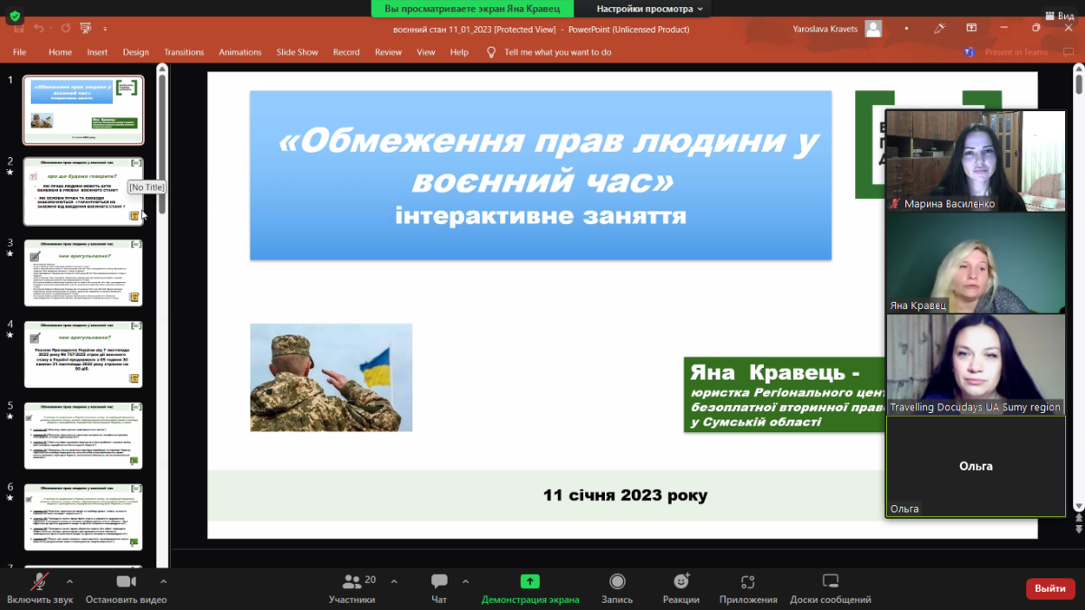 У рамках зустрічі присутні мали змогу обговорити разом із юристкою Регіонального центру з надання БВПД у Сумській області Яною Кравець наступні питання: