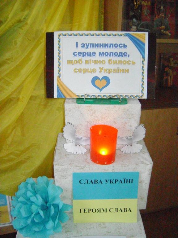 З метою вшанування пам’яті Героїв Небесної Сотні, людей, що мужньо і хоробро відстоювали нашу незалежність та нашу єдність, людей, які вкотре довели, що Україна завжди боротиметься за свою свободу, в бібліотеці створено інсталяцію-вшанування «І зупинилось серце молоде, щоб вічно билось серце України». Сміливість Героїв Небесної Сотні стала сміливістю для нового курсу нашої держави. Тоді хід історії України було змінено, бо разом із героями піднялися мільйони українців.