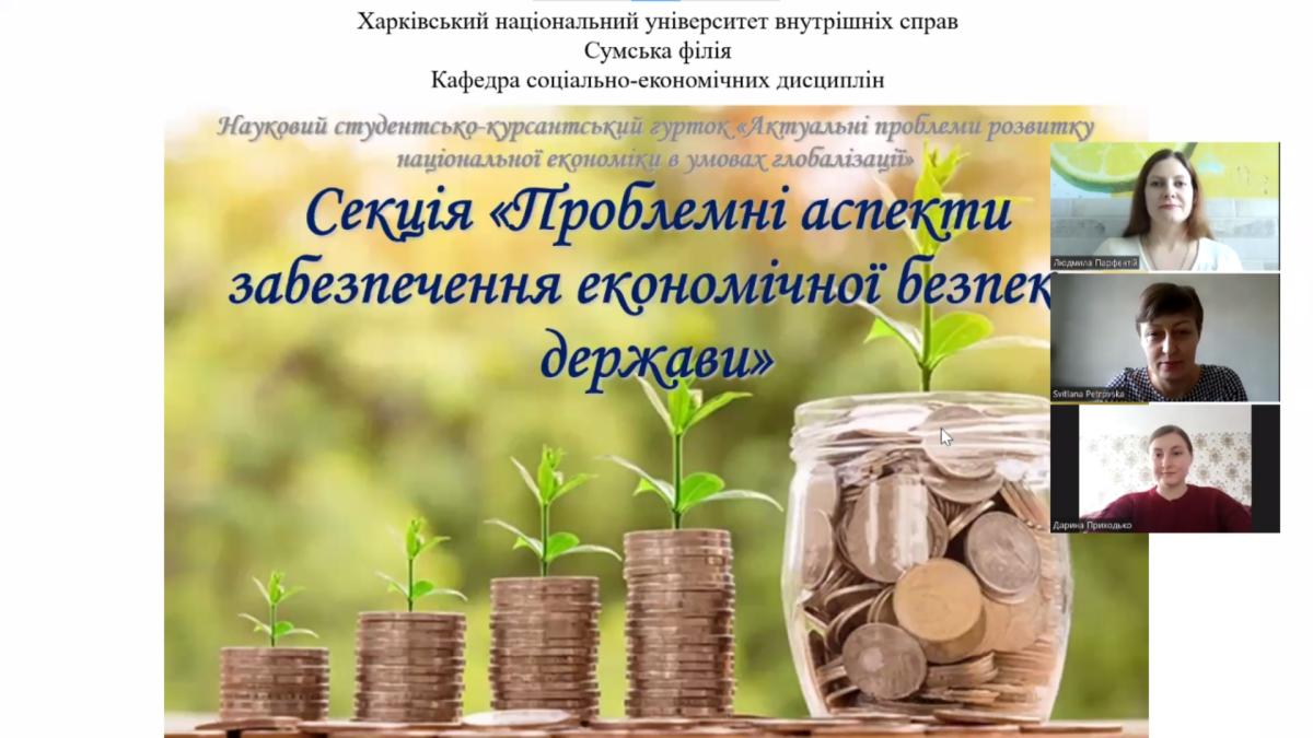 Зважаючи на це, відбулося чергове засідання секції «Проблемні аспекти забезпечення економічної безпеки держави» наукового студентсько-курсантського гуртка кафедри соціально-економічних дисциплін Сумської філії Харківського національного університету внутрішніх справ «Актуальні проблеми розвитку національної економіки в умовах глобалізації».