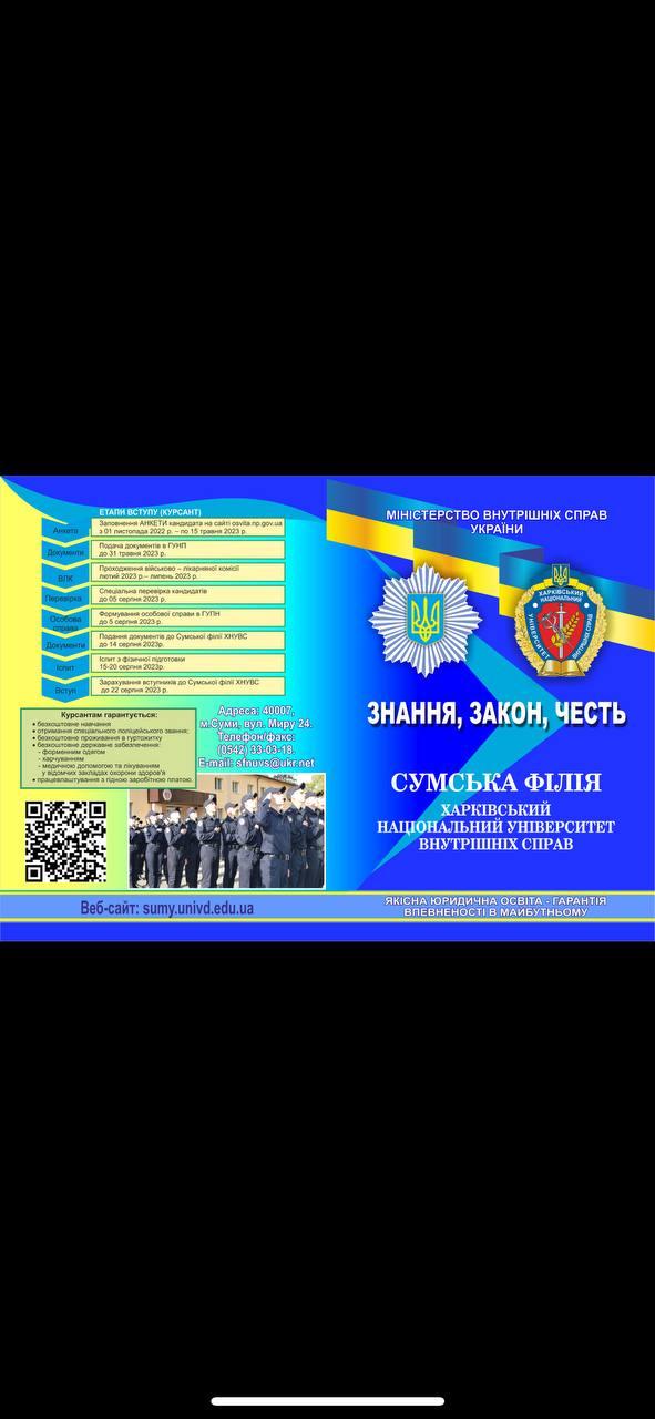 17 лютого 2023 року завідувачкою кафедри юридичних дисциплін Сумської філії ХНУВС Панасюк Оксаною Володимирівною та здобувачкою вищої освіти другого (магістерського) рівня Гайдар Мариною у співробітництві з Охріменко Наталією Вікторівною було проведено профорієнтаційну онлайн-бесіду з учнями 11-го класу Сумського закладу загальної середньої освіти I-III ступенів № 21 Сумської міської ради.
