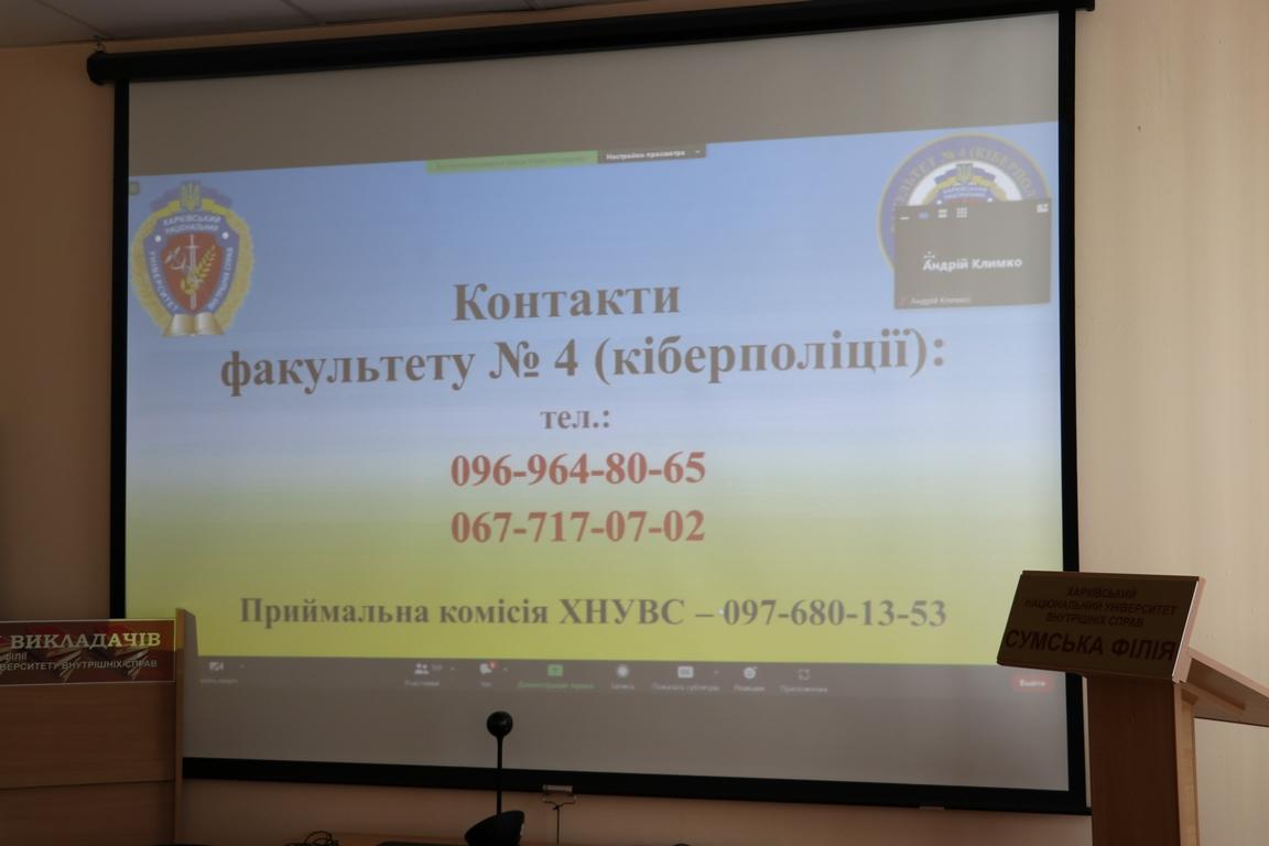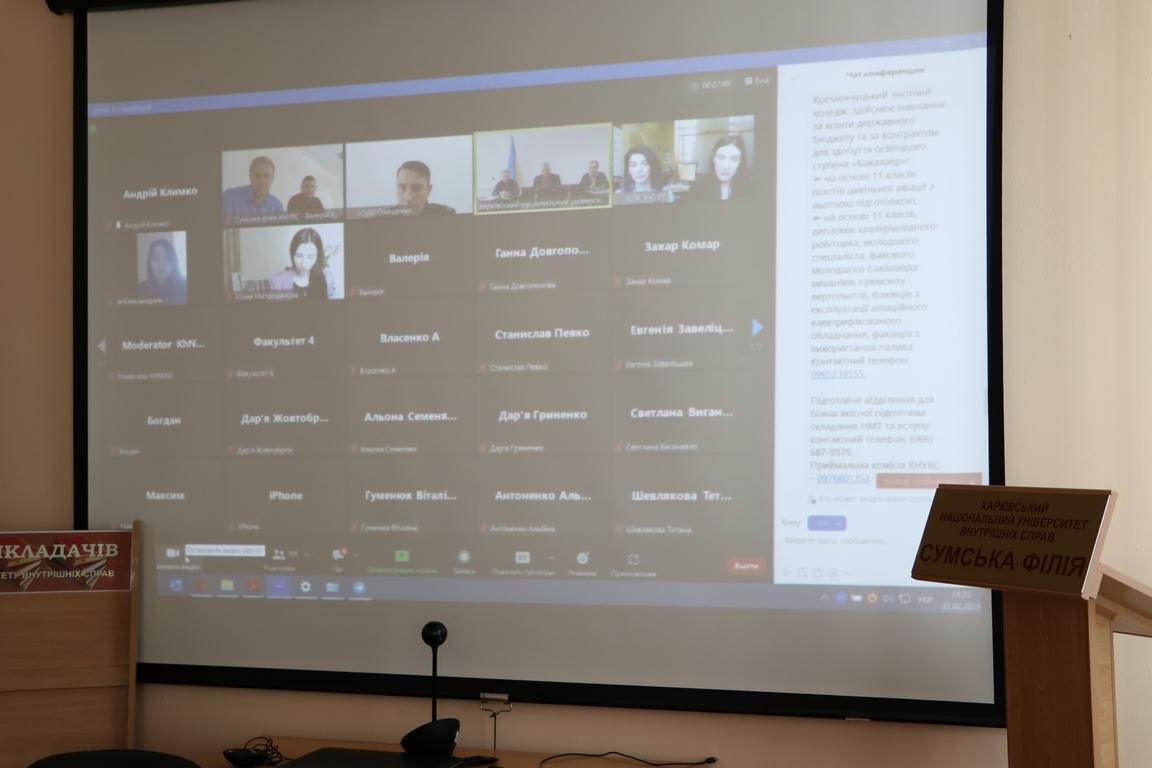 Згідно з Планом-графіком проведення онлайн – зустрічей із абітурієнтами ХНУВС на січень-лютий 2023 року, затвердженого проректором ХНУВС Анатолієм Клочко, 22 лютого була проведена онлайн-зустріч за участі представників усіх факультетів ХНУВС, Кременчуцького льотного коледжу та Сумської філії ХНУВС із майбутніми абітурієнтами ЗВО 2023 року. Організатором зустрічі виступила Сумська філія ХНУВС.