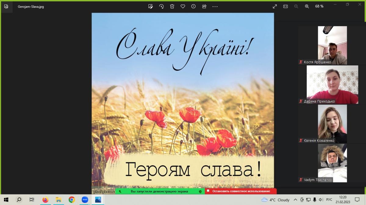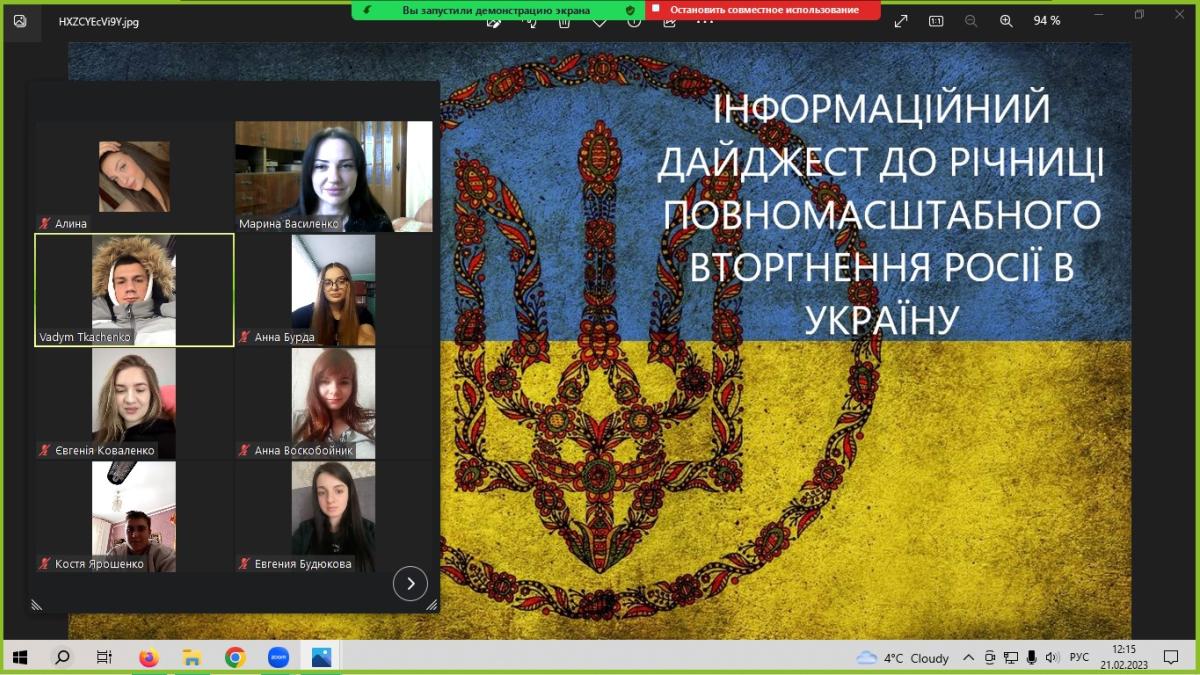 Відповідно до плану національно-патріотичного виховання напередодні роковин вторгнення росії на територію України зі студентами 4-го курсу першого (бакалаврського) рівня вищої освіти спеціальності 081 Право групи СФдср-19-2 Сумської філії ХНУВС куратором Василенко Мариною було проведено інформаційний дайджест.