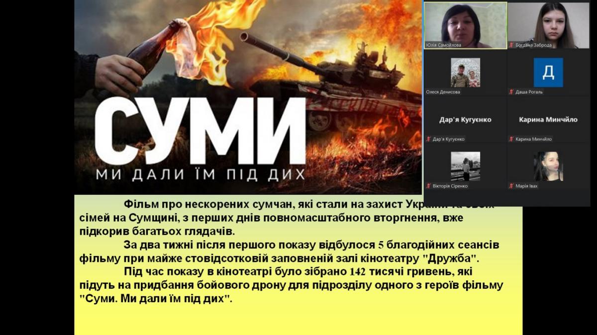 На виконання Плану проведення у Харківському національному університету внутрішніх справ заходів з нагоди річниці початку широкомасштабної збройної агресії російської федерації проти України куратором Юлією Самойловою було організовано перегляд патріотичних, документальних, художніх фільмів про військову агресію РФ серед здобувачів вищої освіти кураторської групи СФ-ПДдср-22-1. Особливу увагу приділили фільму «Суми. Ми дали їм під дих» - фільм про нескорених сумчан, які стали на захист України та своїх сімей на Сумщині з перших днів повномасштабного вторгнення. Відбулося 5 благодійних сеансів фільму в кінотеатрі "Дружба". Під час показу в кінотеатрі було зібрано 142 тисячі гривень, які підуть на придбання бойового дрону для підрозділу одного з героїв фільму "Суми. Ми дали їм під дих".