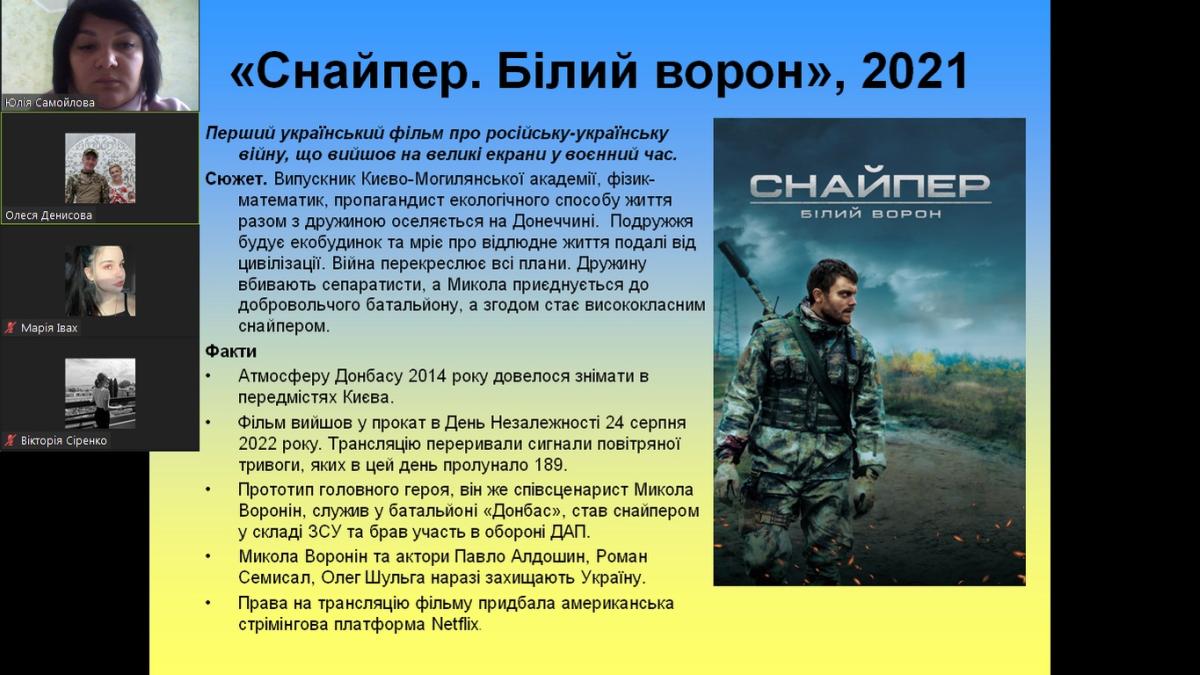 Окрім того, переглянули та обговорили фільми «Снайпер. Білий ворон» (перший український фільм про російську-українську війну, що вийшов на великі екрани у воєнний час, актори якого наразі захищають Україну) та «Йди за мною» (фільм засновано на реальних кадрах, знятих дронами під час рятувальній операції ЗСУ, яку провели військові 93-ї бригади «Холодний Яр» під Ізюмом у період запеклих боїв за місто; у головних ролях справжні учасники подій).