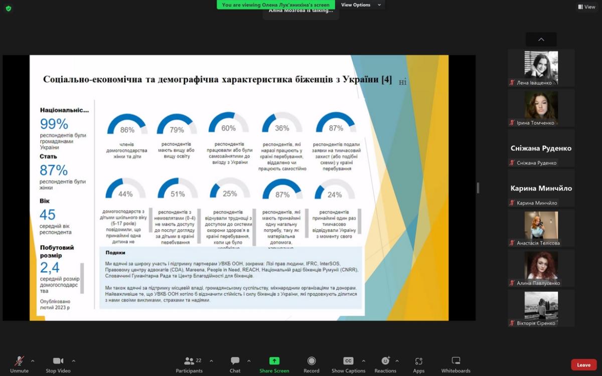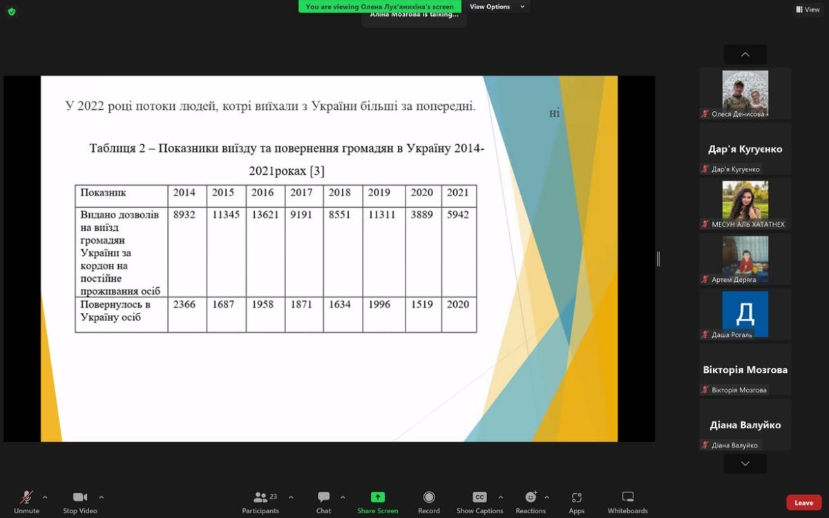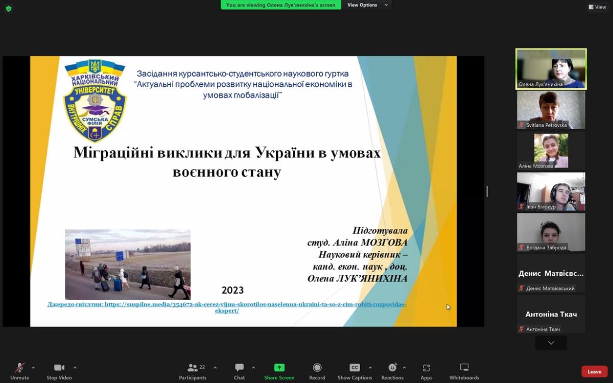 22 лютого 2023 року відбулось розширене планове онлайн засідання наукового гуртка кафедри соціально-економічних дисциплін Сумської філії ХНУВС «Актуальні проблеми розвитку національної економіки в умовах глобалізації» на тему «Міграційні виклики для України в умовах воєнного стану», доповідач студентка 1-го курсу Аліна Мозгова (наук. керівник канд.екон.наук, доцент Олена Лук’янихіна).