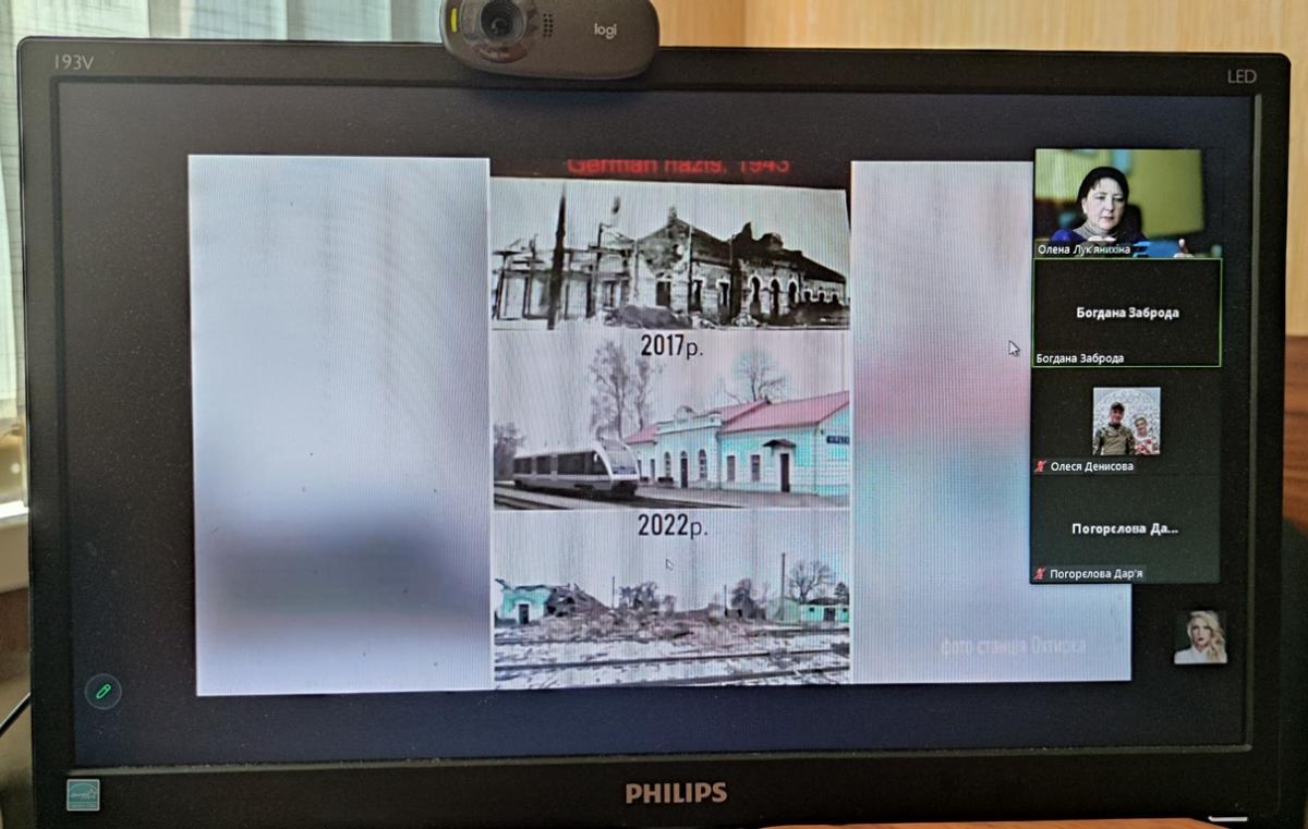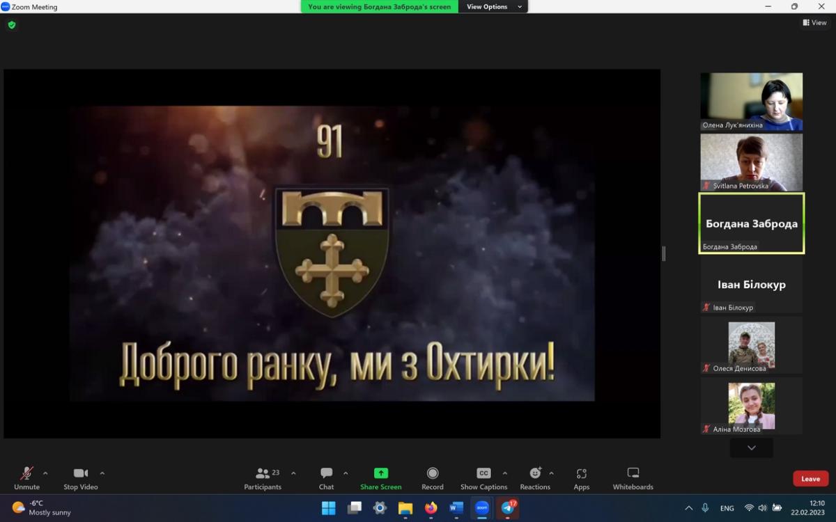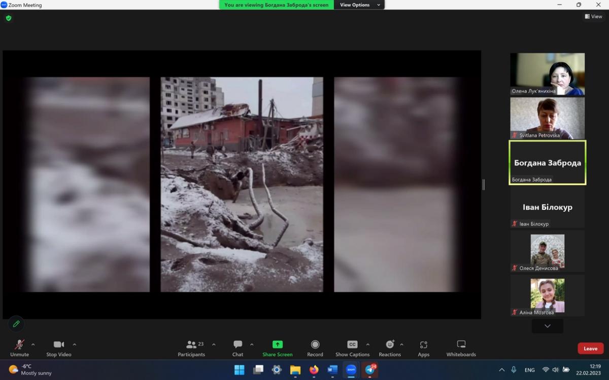 У другій половині засідання першокурсниця Богдана Заброда розповіла про події на початку війни в м. Охтирка та Тростянець і про героїчний супротив військових, містян, котрі забезпечили неможливість просування загарбників до Сум, Полтави та Києва. Про наслідки руйнувань після авіаударів, масованих обстрілів, біль та емоції після пережитого побачили під час перегляду відео.